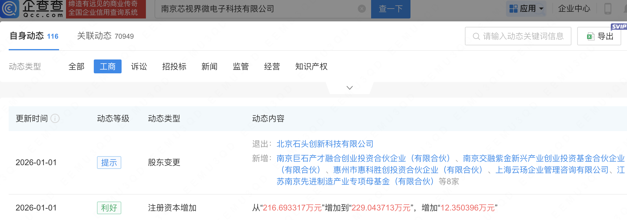 企查查APP显示,近日,南京芯视界微电子科技有限公司发生工商变更,新增蚂蚁科技集团股份有限公司全资子公司上海云玚企业管理咨询有限公司等为股东,同时注册资本增至229.04万元。企查查信息显示,该公司成立于2018年,经营范围包含:从事半导体科技电子产品领域内的技术开发、技术转让、技术咨询和技术服务等。公开信息显示,该公司拥有芯片级的光电转换器件设计和单光子检测成像技术,主营基于单光子探测的一维和三维ToF传感芯片。