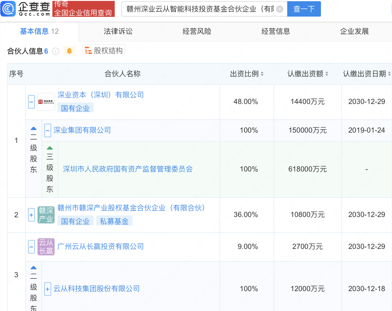 企查查APP显示,近日,赣州深业云从智能科技投资基金合伙企业(有限合伙)成立,出资额3亿元,经营范围包含:以私募基金从事股权投资、投资管理、资产管理等活动。企查查股权穿透显示,该企业由深业资本(深圳)有限公司、云从科技(688327)全资子公司广州云从长嬴投资有限公司等共同出资。