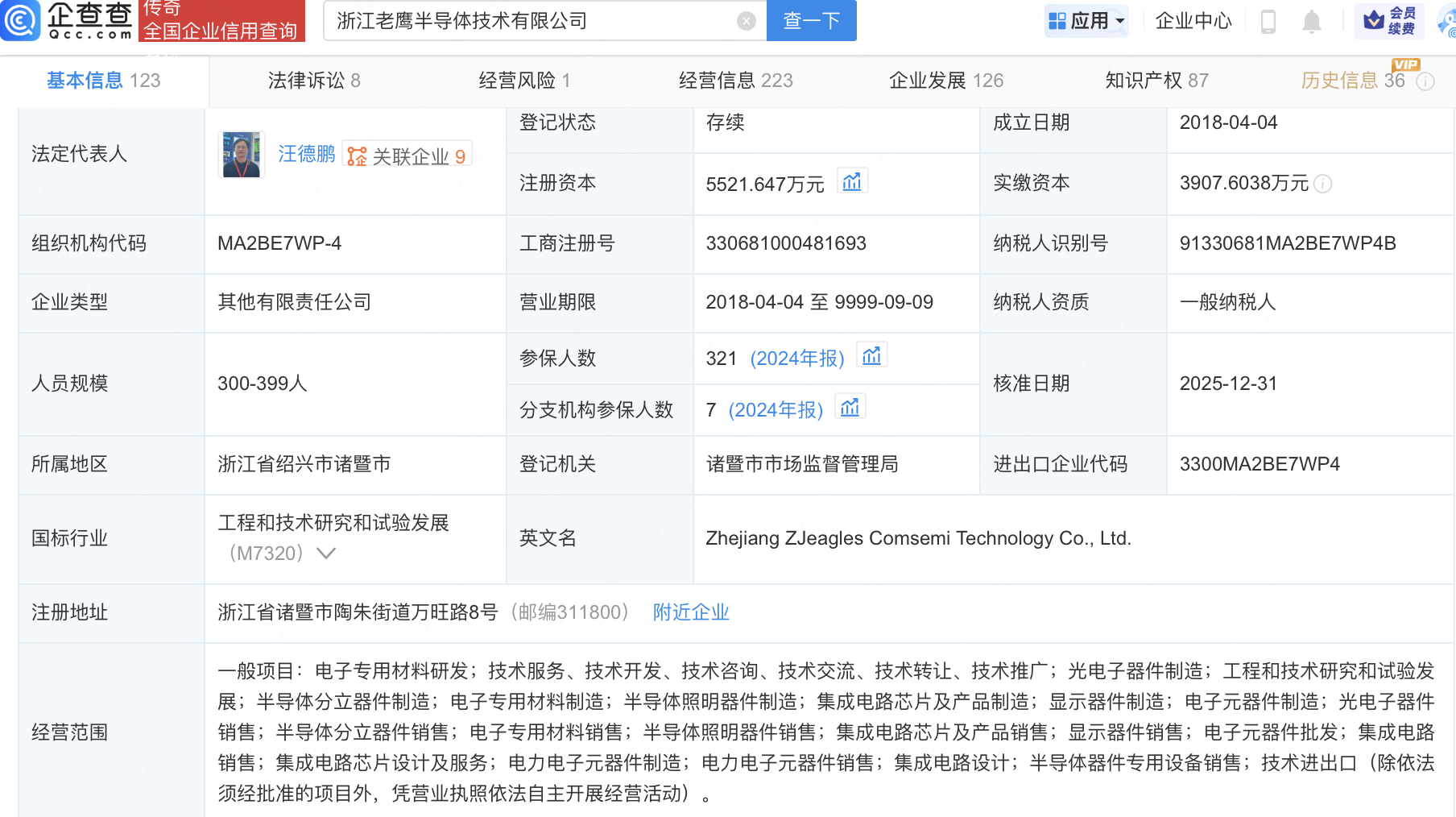 企查查APP显示,近日,浙江老鹰半导体技术有限公司发生工商变更,新增茅台金石(贵州)产业发展基金合伙企业(有限合伙)等为股东,同时注册资本增至5521.65万元。企查查信息显示,该公司成立于2018年,经营范围包含:半导体照明器件制造;集成电路芯片及产品制造;显示器件制造等。公开信息显示,老鹰半导体是一家光互连VCSEL芯片IDM企业,专注于为AI智算中心、车载雷达和高阶智能机器人提供创新的高速传输与智能感知核心芯片、器件与应用解决方案。