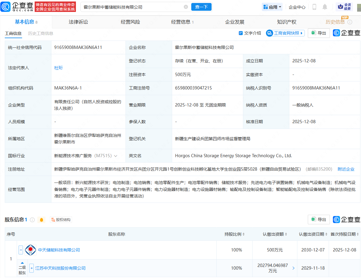 企查查APP显示,近日,霍尔果斯中蓄储能科技有限公司成立,法定代表人为杜珩,经营范围包含:电池制造;电池销售;电池零配件生产;电池零配件销售;储能技术服务;先进电力电子装置销售等。企查查股权穿透显示,该公司由中天科技(600522)间接全资持股。