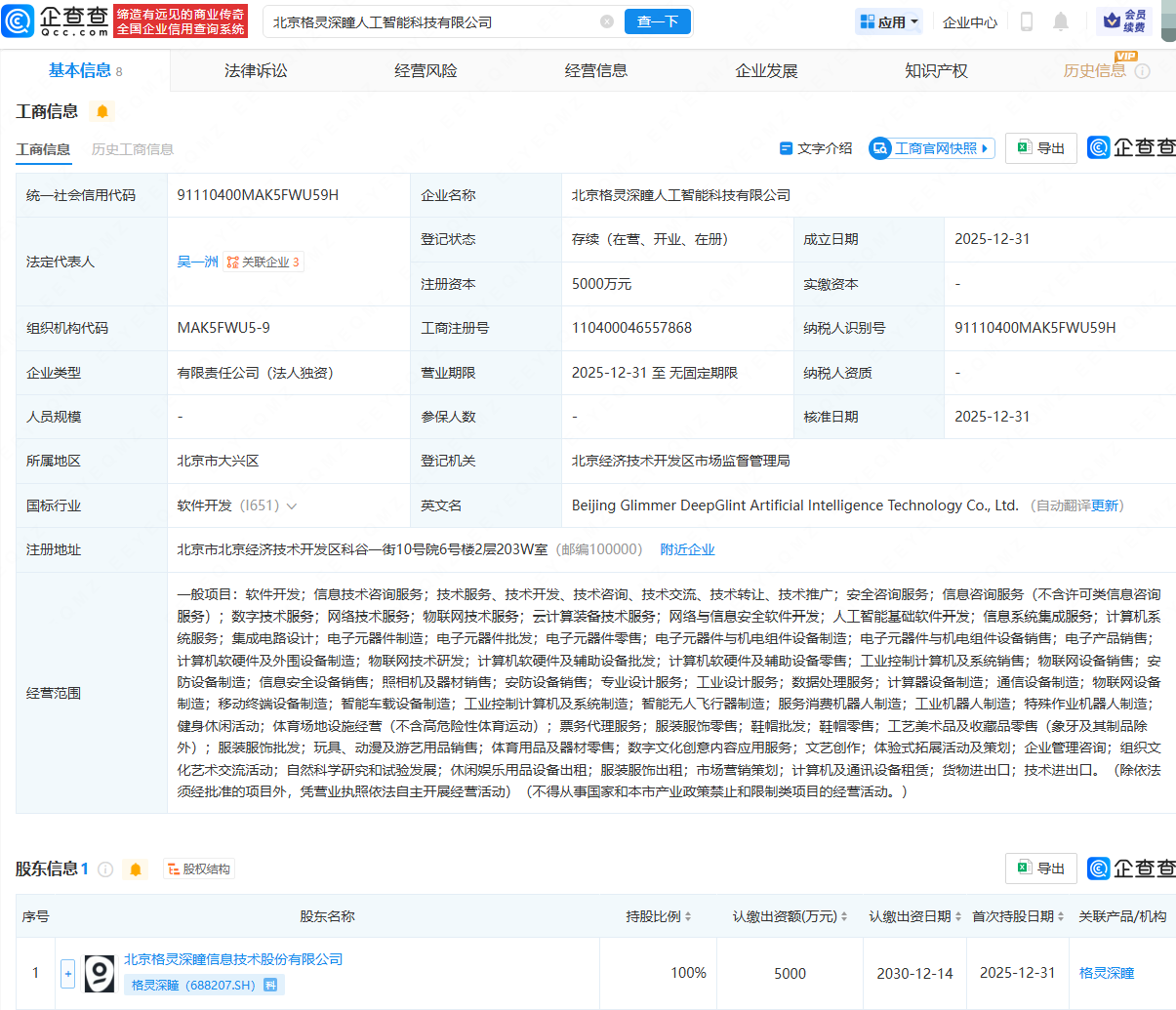 企查查APP显示,近日,北京格灵深瞳人工智能科技有限公司成立,法定代表人为吴一洲,注册资本为5000万元,经营范围包含:人工智能基础软件开发;信息系统集成服务;计算机系统服务;集成电路设计;电子元器件制造等。企查查股权穿透显示,该公司由格灵深瞳(688207)全资持股。