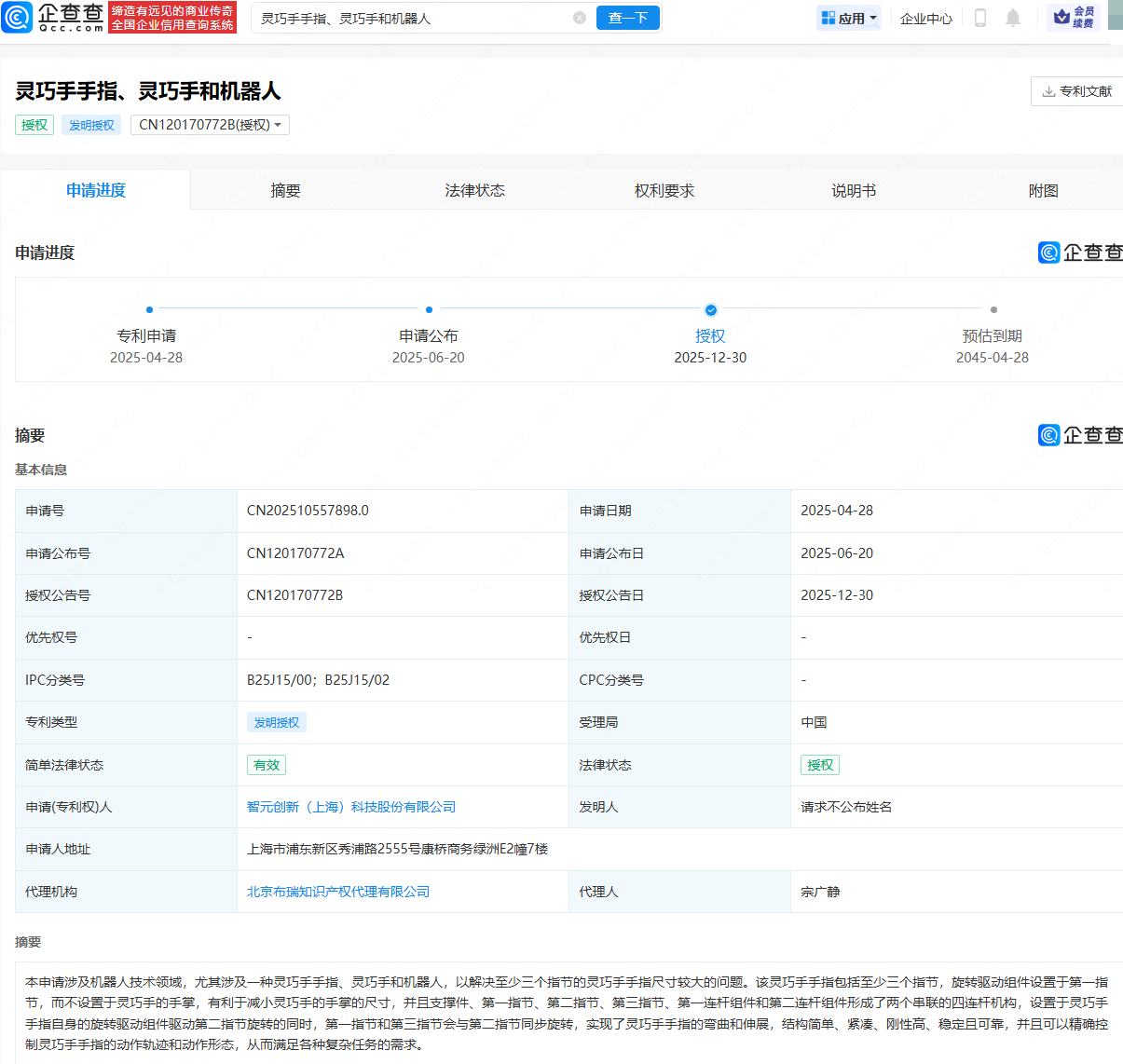 企查查APP显示,近日,智元机器人关联公司智元创新(上海)科技股份有限公司申请的“灵巧手手指、灵巧手和机器人”专利获授权。