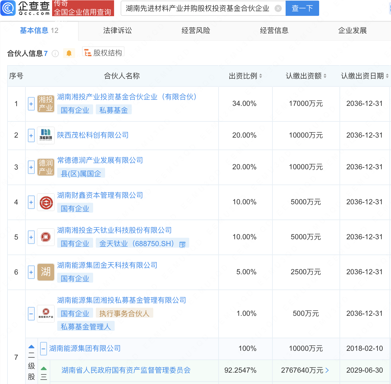 企查查APP显示,近日,湖南先进材料产业并购股权投资基金合伙企业(有限合伙)成立,出资额5亿元,经营范围包含:以私募基金从事股权投资、投资管理、资产管理等活动。企查查股权穿透显示,该企业由金天钛业(688750)、湖南能源集团湘投私募基金管理有限公司等共同出资。