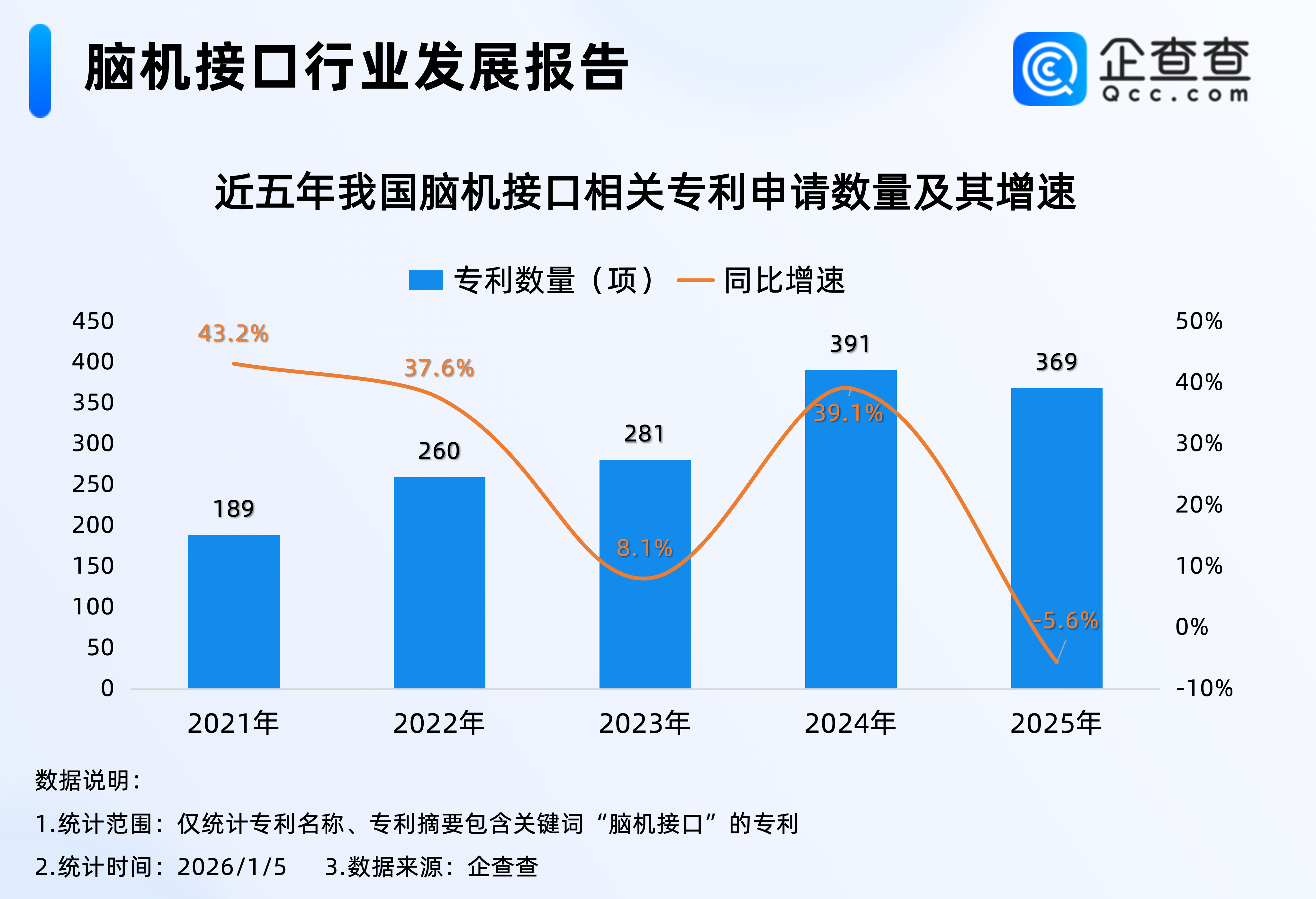 企查查数据显示,截至2026年年初,我国现有2041项脑机接口相关专利,类型上以发明专利为主,占比超9成。近五年我国累计申请1490项脑机接口相关专利,其中2024年累计申请391项,达近五年专利申请量峰值。