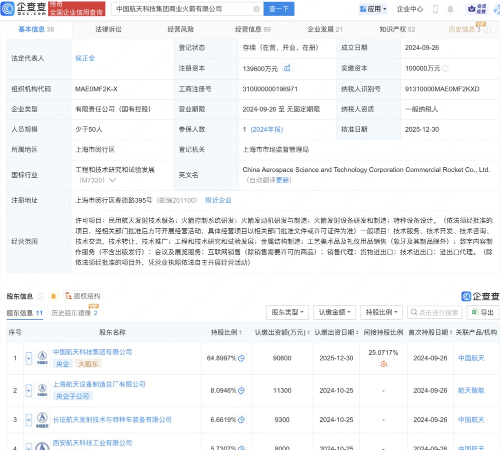 企查查APP显示,近日,中国航天科技集团商业火箭有限公司发生工商变更,注册资本由10亿元增至13.96亿元。企查查信息显示,该公司成立于2024年,法定代表人为候正全,经营范围包括民用航天发射技术服务、火箭控制系统研发、火箭发动机研发与制造、火箭发射设备研发和制造等,由中国航天科技集团有限公司、上海航天设备制造总厂有限公司、长征航天发射技术与特种车装备有限公司等共同持股。