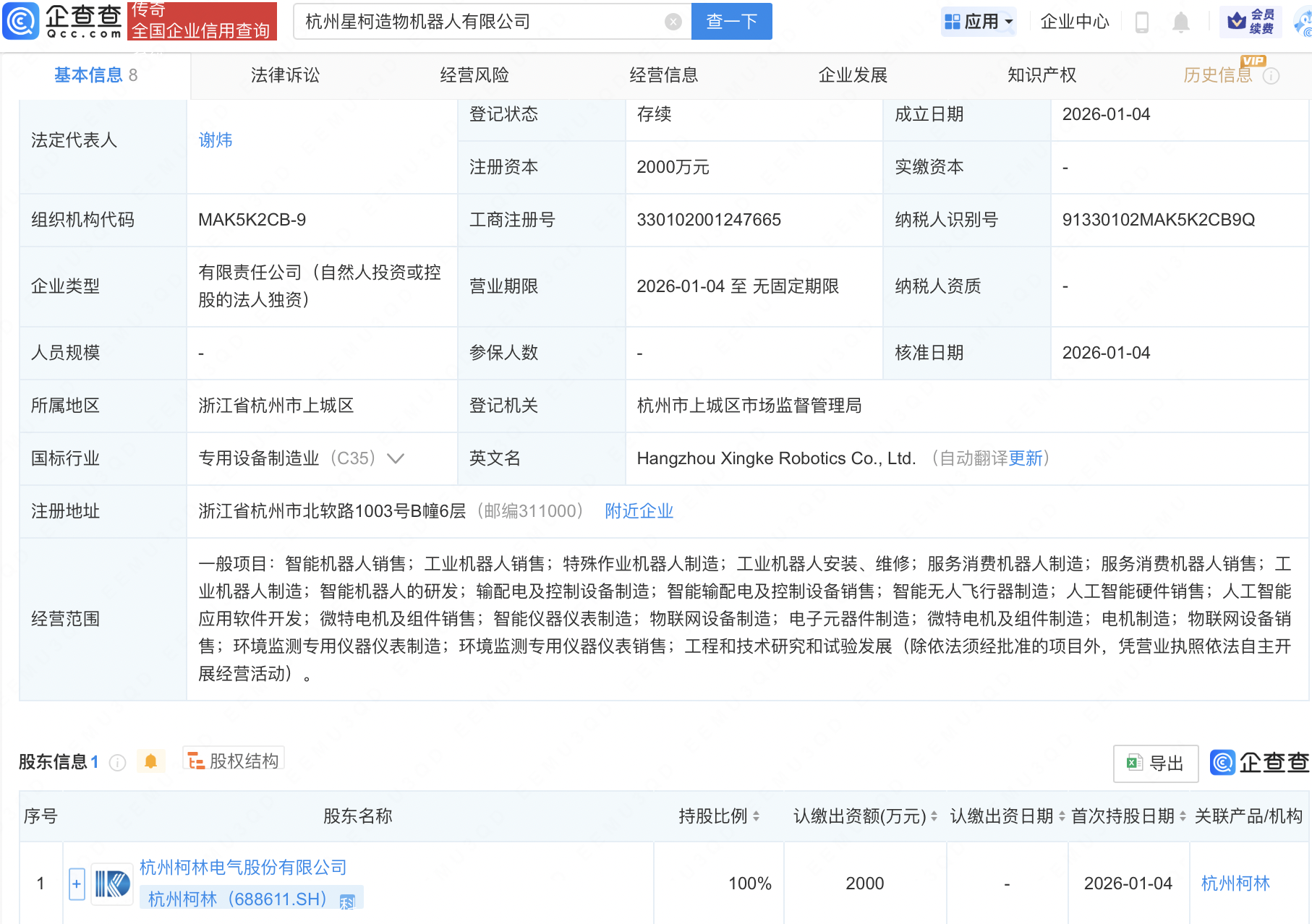 企查查APP显示,近日,杭州星柯造物机器人有限公司成立,注册资本2000万元,经营范围包含:智能机器人的研发;智能无人飞行器制造;人工智能硬件销售;人工智能应用软件开发等。企查查股权穿透显示,该公司由杭州柯林(688611)全资持股。