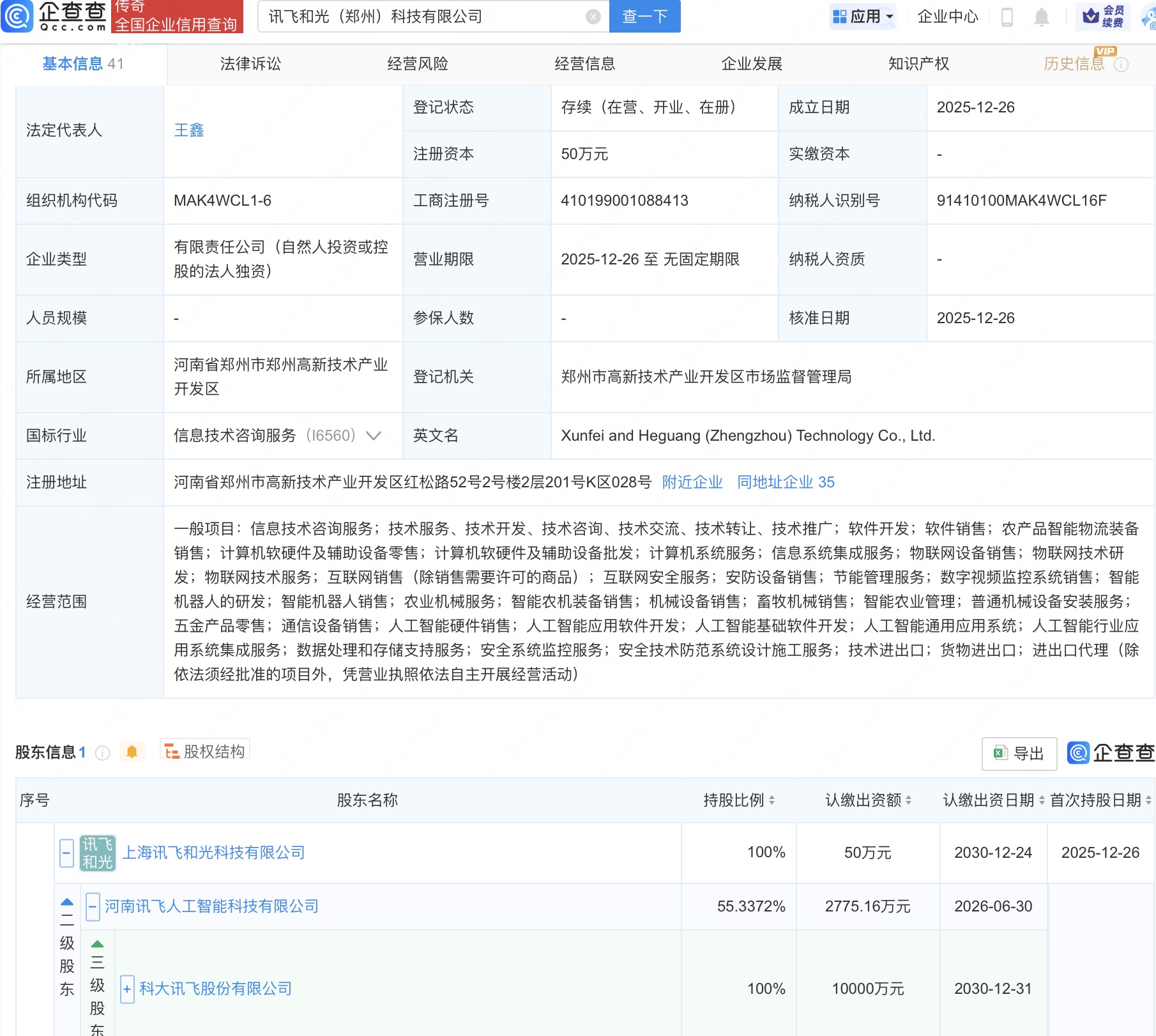 企查查APP显示,近日,讯飞和光(郑州)科技有限公司成立,法定代表人为王鑫,经营范围含物联网设备销售、智能机器人的研发、人工智能应用软件开发、人工智能基础软件开发、人工智能通用应用系统等。企查查股权穿透显示,该公司由科大讯飞(002230)旗下上海讯飞和光科技有限公司全资持股。
