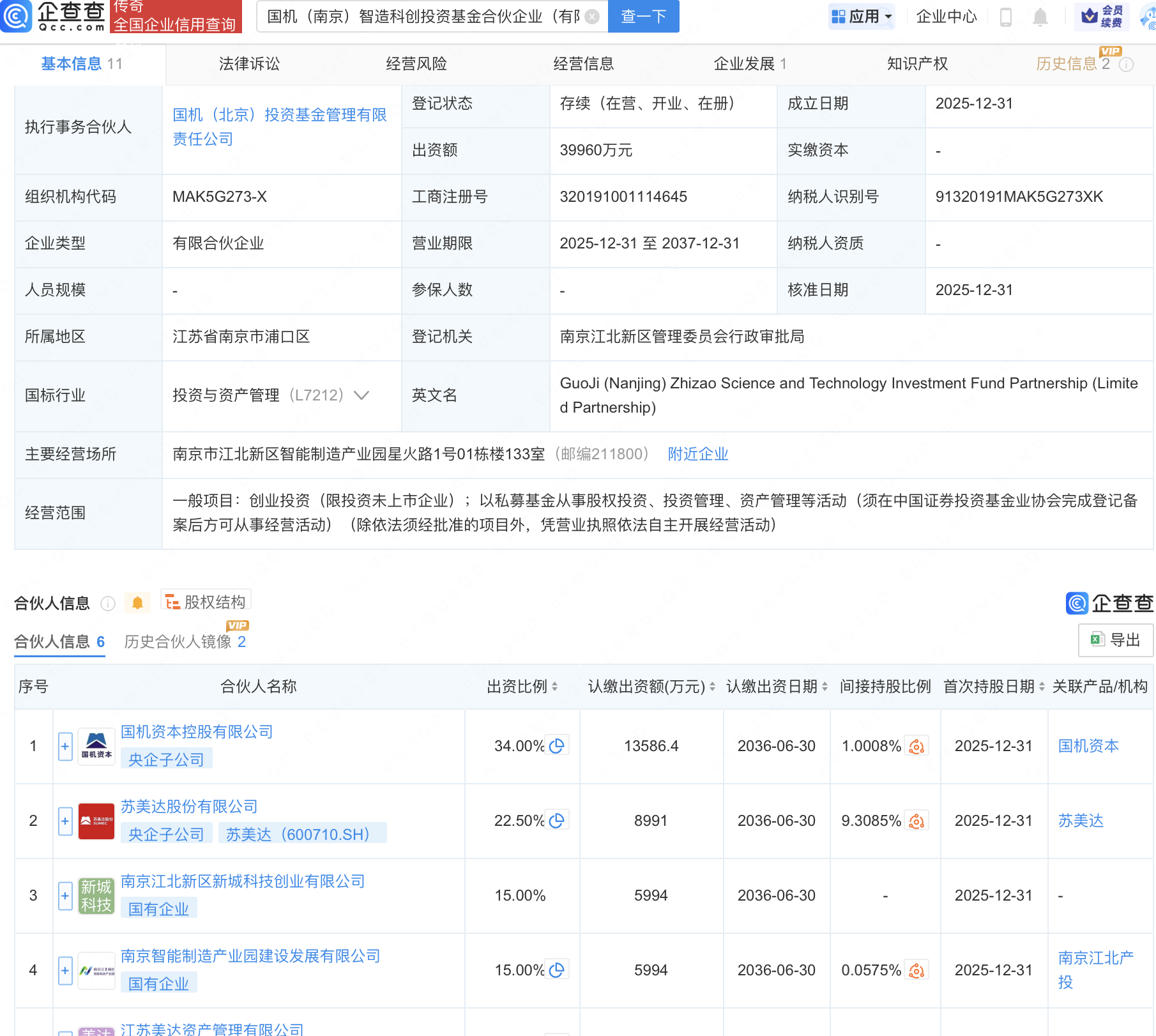 企查查APP显示,近日,国机(南京)智造科创投资基金合伙企业(有限合伙)成立,经营范围包含:创业投资(限投资未上市企业);以私募基金从事股权投资、投资管理、资产管理等活动。企查查股权穿透显示,该企业由苏美达(600710)、国机资本控股有限公司等共同出资。