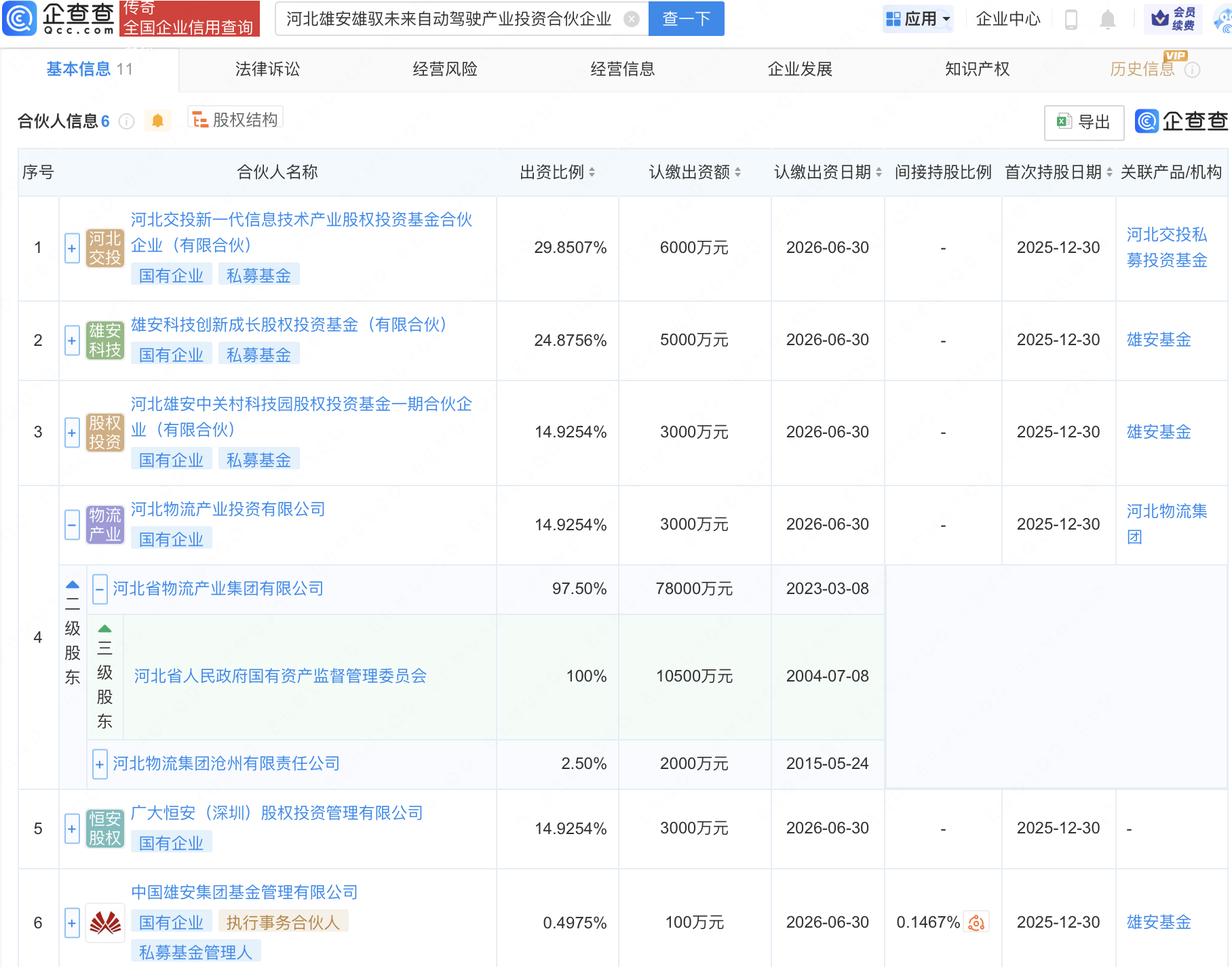 企查查APP显示,近日,河北雄安雄驭未来自动驾驶产业投资合伙企业(有限合伙)成立,出资额2.01亿元,经营范围包含:以自有资金从事投资活动。企查查股权穿透显示,该企业由雄安科技创新成长股权投资基金(有限合伙)、河北物流产业投资有限公司、中国雄安集团基金管理有限公司等共同出资。