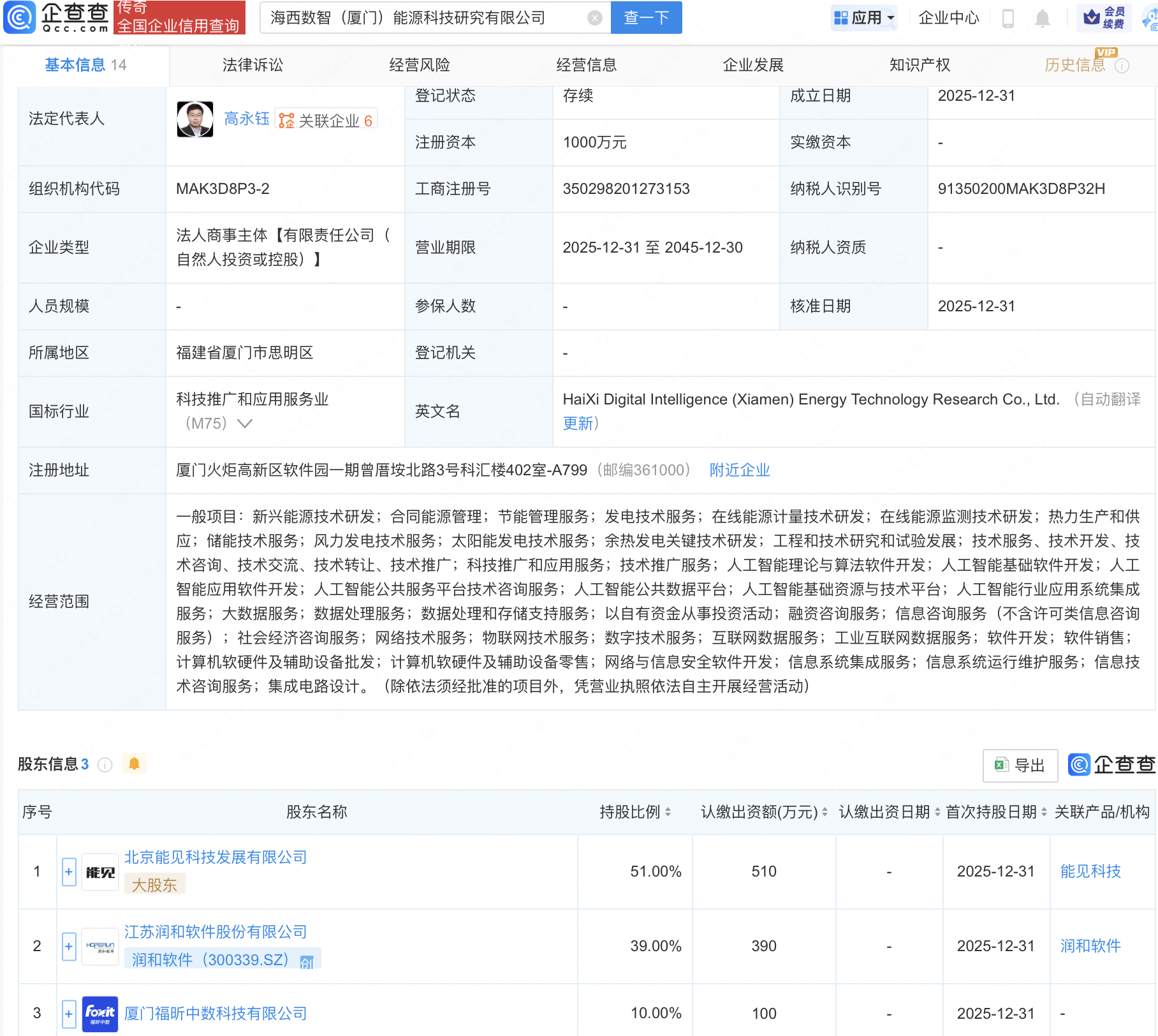 企查查APP显示,近日,海西数智(厦门)能源科技研究有限公司成立,注册资本1000万元,经营范围包含:人工智能理论与算法软件开发;人工智能基础软件开发;人工智能应用软件开发;人工智能公共服务平台技术咨询服务等。企查查股权穿透显示,该公司由润和软件(300339)等共同持股。
