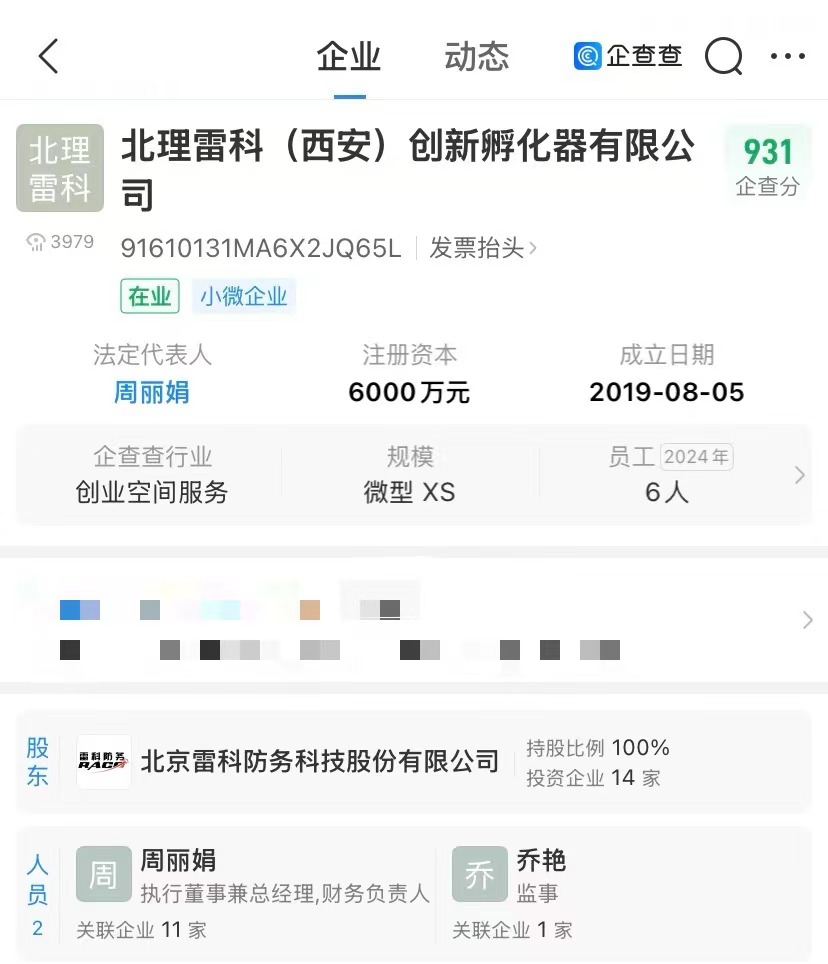 企查查显示,北理雷科(西安)创新孵化器有限公司成立于2019年8月,法定代表人为周丽娟,由雷科防务(002413)全资持股。