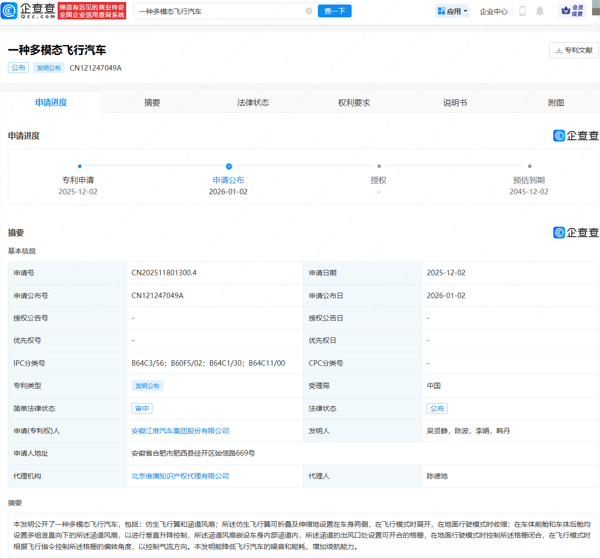 企查查APP显示,近日,江淮汽车(600418)申请公布“一种多模态飞行汽车”专利。