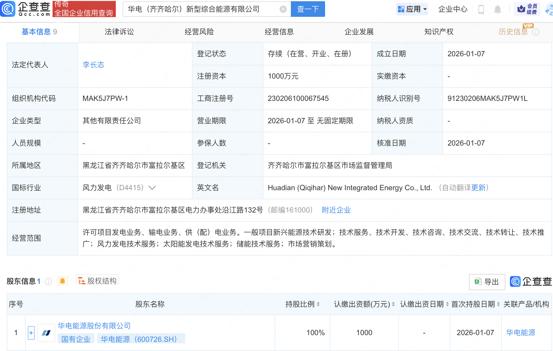 企查查APP显示,近日,华电(齐齐哈尔)新型综合能源有限公司成立,注册资本1000万元,经营范围包含:风力发电技术服务;太阳能发电技术服务;储能技术服务等。企查查股权穿透显示,该公司由华电能源(600726)全资持股。