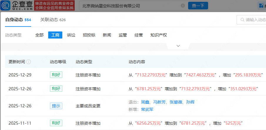 企查查APP显示,近日,北京微纳星空科技股份有限公司注册资本从7132.28万元增加到7427.46万元。此前,该公司已连续多次增资,且高管发生变更。