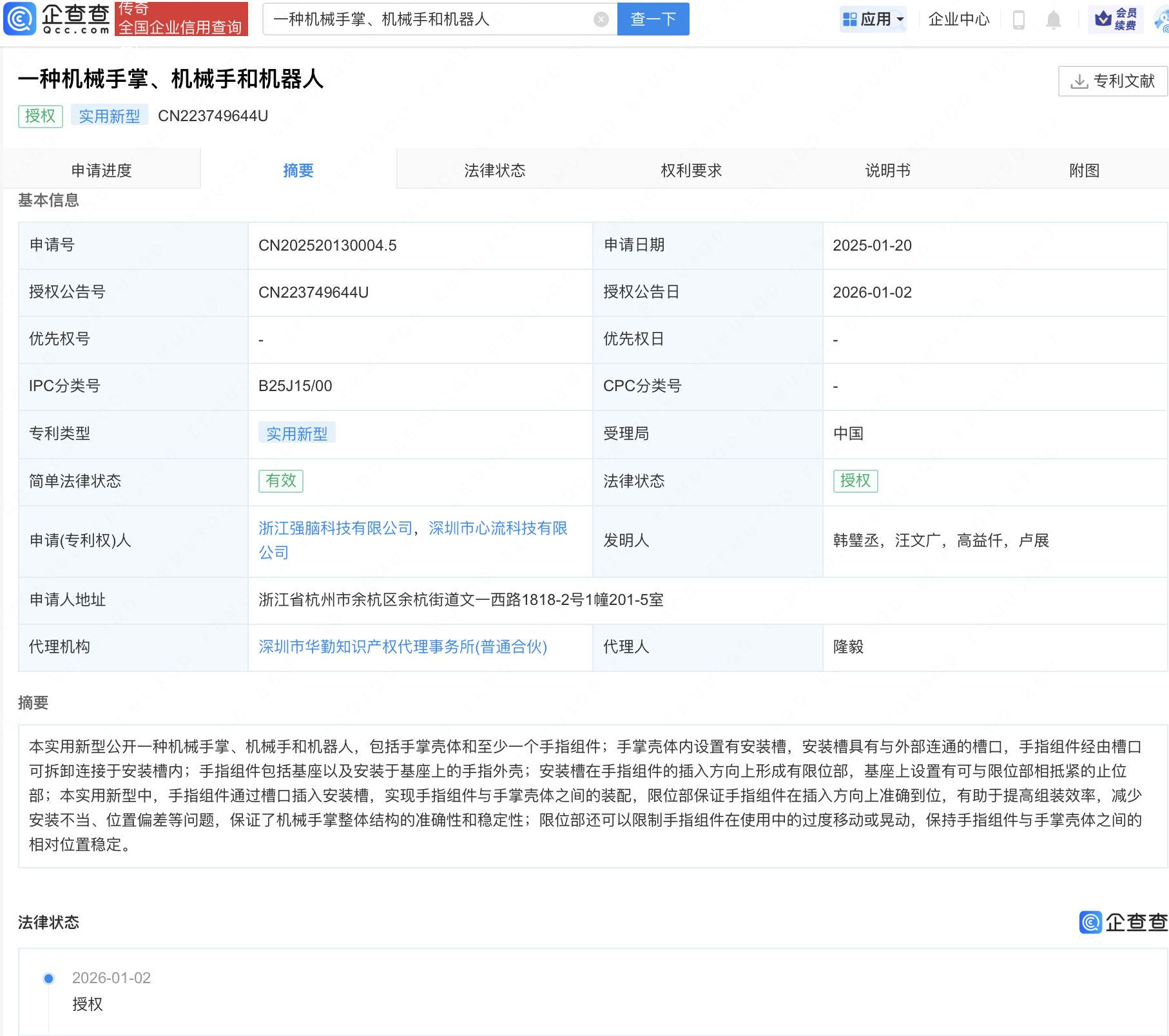 企查查APP显示,近日,浙江强脑科技有限公司及其全资子公司深圳市心流科技有限公司申请的“一种机械手掌、机械手和机器人”专利获授权。企查查专利摘要显示,本公开包括手掌壳体和至少一个手指组件;手掌壳体内设置有安装槽,安装槽具有与外部连通的槽口,手指组件经由槽口可拆卸连接于安装槽内;手指组件包括基座以及安装于基座上的手指外壳;安装槽在手指组件的插入方向上形成有限位部,基座上设置有可与限位部相抵紧的止位部;本实用新型中,手指组件通过槽口插入安装槽,实现手指组件与手掌壳体之间的装配,限位部保证手指组件在插入方向上准确到位,有助于提高组装效率,减少安装不当、位置偏差等问题,保证了机械手掌整体结构的准确性和稳定性;限位部还可以限制手指组件在使用中的过度移动或晃动,保持手指组件与手掌壳体之间的相对位置稳定。