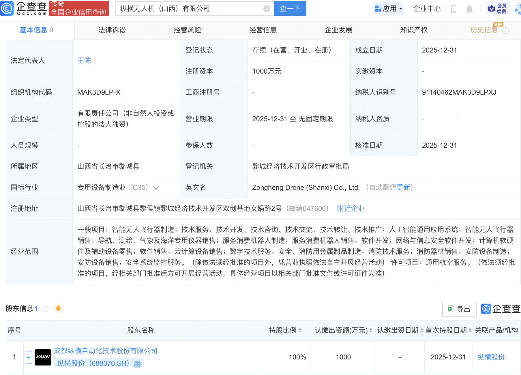 企查查APP显示,近日,纵横无人机(山西)有限公司成立,注册资本1000万元,经营范围包含:人工智能通用应用系统;智能无人飞行器销售;导航、测绘、气象及海洋专用仪器销售;服务消费机器人制造等。企查查股权穿透显示,该公司由纵横股份(688070)全资持股。