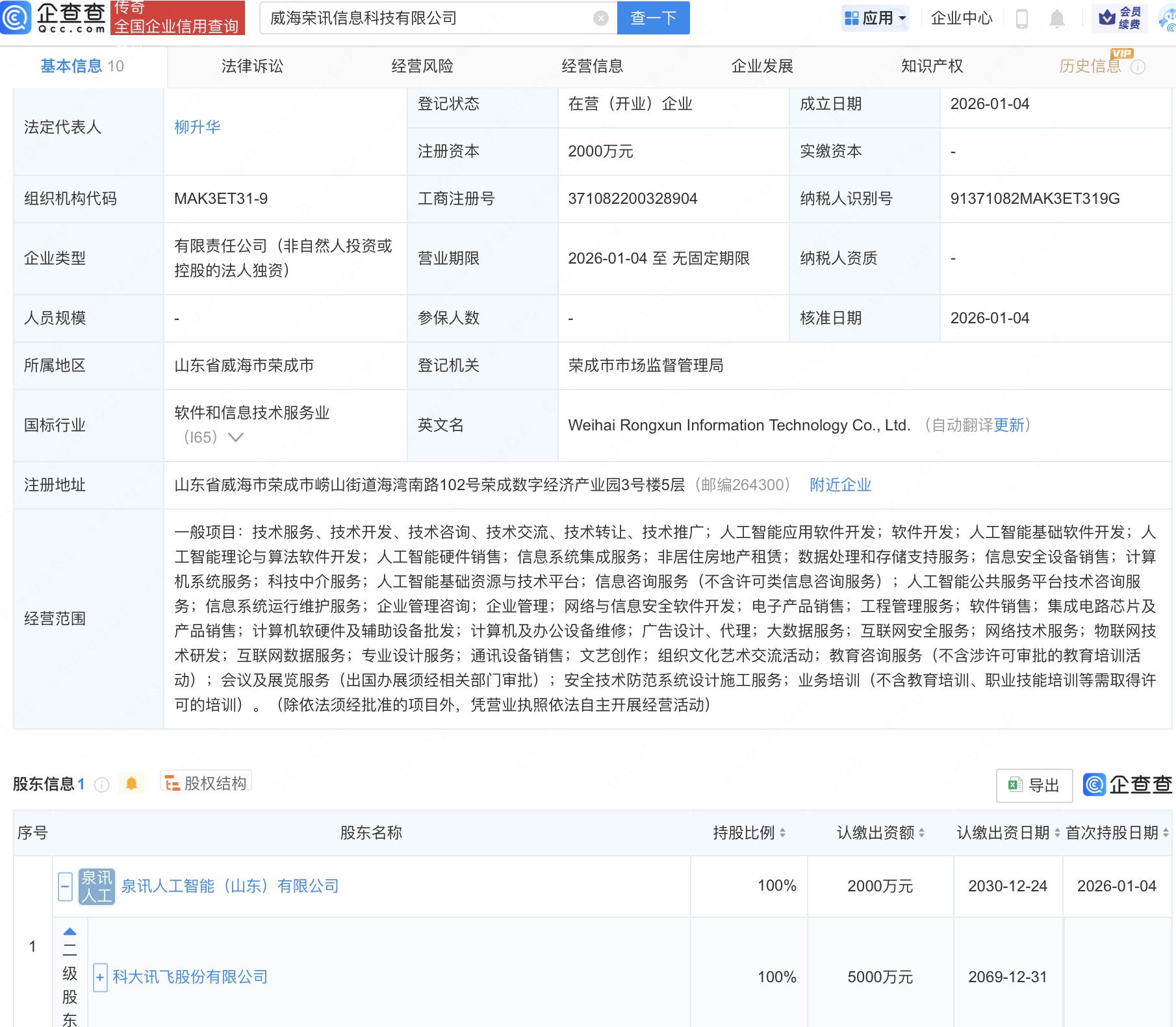 企查查APP显示,近日,威海荣讯信息科技有限公司成立,法定代表人为柳升华,注册资本2000万人民币,经营范围含人工智能应用软件开发、软件开发、人工智能基础软件开发、人工智能理论与算法软件开发等。企查查股权穿透显示,该公司由科大讯飞(002230)间接全资持股。