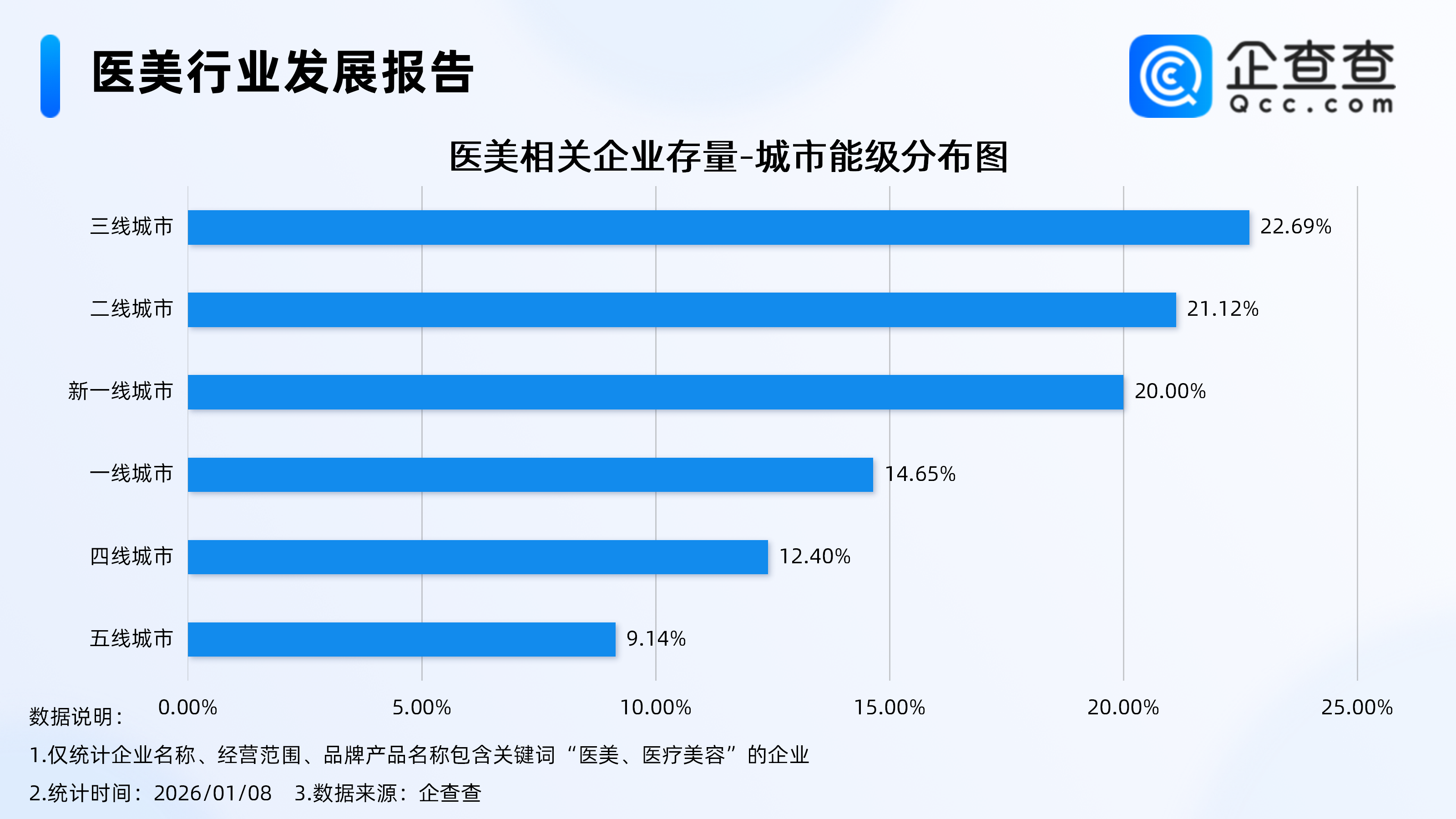 企查查数据显示,截至1月8日,国内现存医美相关企业18.69万家。随着颜值主义的盛行及“悦己消费”的风靡,近十年医美迎来快速发展时期,行业规模不断扩大,从相关企业年末存量分布来看,2022年末医美相关企业存量首次突破十万家,达10.21万家。2025年末全国医美相关企业存量达18.61万家。从经营时间来看,超5成医美相关企业在近三年成立,成立年限在1-3年的相关企业最多,占比38.27%。从城市能级分布来看,医美相关企业多分布在三线城市,占比22.69%。