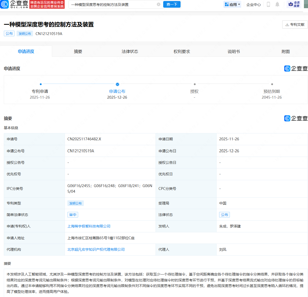 企查查APP显示,近日,MiniMax关联公司上海稀宇极智科技有限公司申请公布“一种模型深度思考的控制方法及装置”专利。