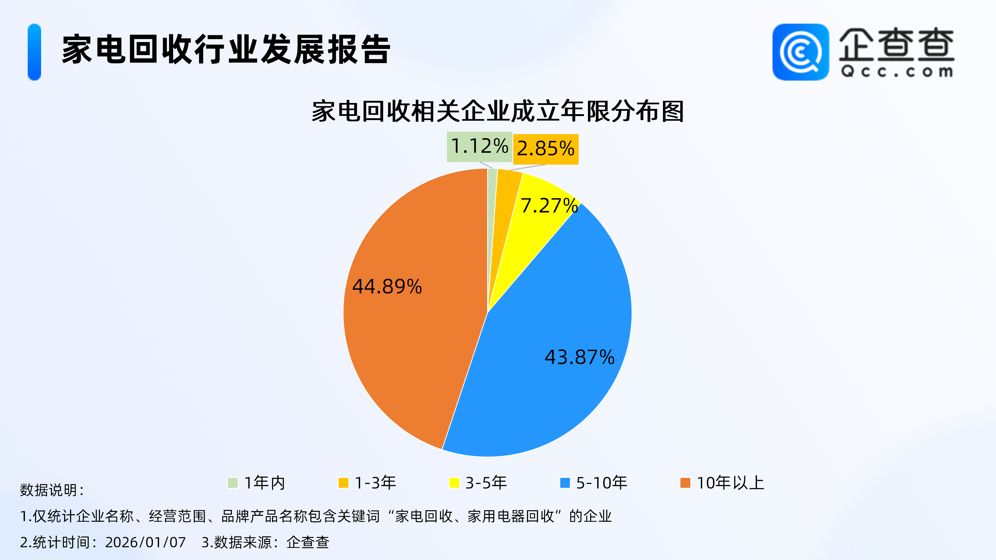 企查查数据显示,截至1月7日,国内现存家电回收相关企业6977家。从经营时间来看,现存家电回收相关企业多为老牌企业,成立年限在10年以上的相关企业最多,占比超四成,达44.89%。其次,在5-10年的相关企业占比43.87%。