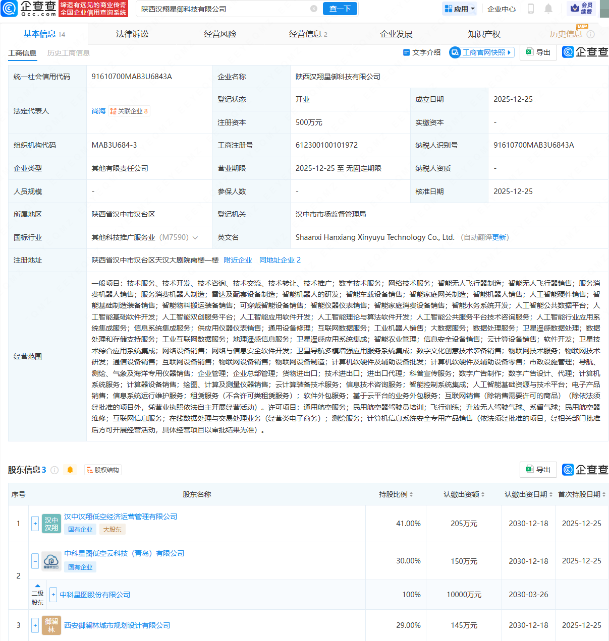 企查查APP显示,近日,陕西汉翔星御科技有限公司成立,法定代表人为尚海,经营范围包含:智能无人飞行器制造;雷达及配套设备制造;智能机器人的研发;人工智能公共数据平台;人工智能基础软件开发等。企查查股权穿透显示,该公司由汉中汉翔低空经济运营管理有限公司、中科星图(688568)旗下中科星图低空云科技(青岛)有限公司等共同持股。