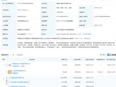 企查查APP显示,近日,石家庄市尚太锂电科技有限公司成立,注册资本5000万元,经营范围包含:石墨及碳素制品制造;石墨及碳素制品销售;非金属矿及制品销售;货物进出口等。企查查股权穿透显示,该公司由尚太科技(001301)全资持股。