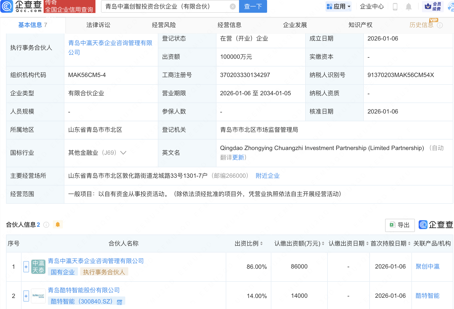 企查查APP显示,近日,青岛中瀛创智投资合伙企业(有限合伙)成立,出资额10亿元,经营范围包含:以自有资金从事投资活动。企查查股权穿透显示,该企业由酷特智能(300840)等共同出资。