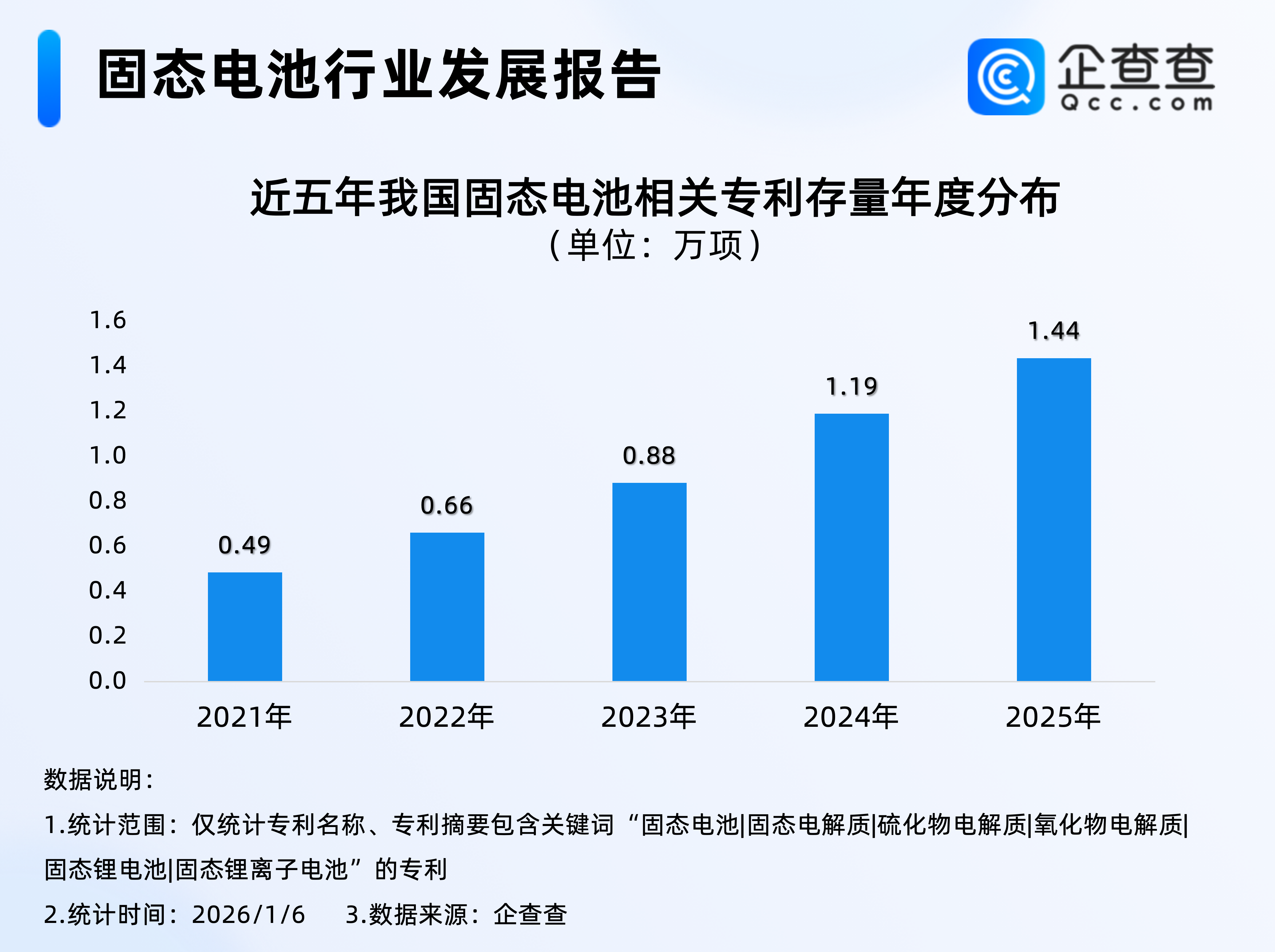 企查查数据显示,2021年以来,我国固态电池相关专利存量逐年增加,并于2024年首次突破1万项,截至2025年年底,我国已有1.44万项固态电池相关专利。
