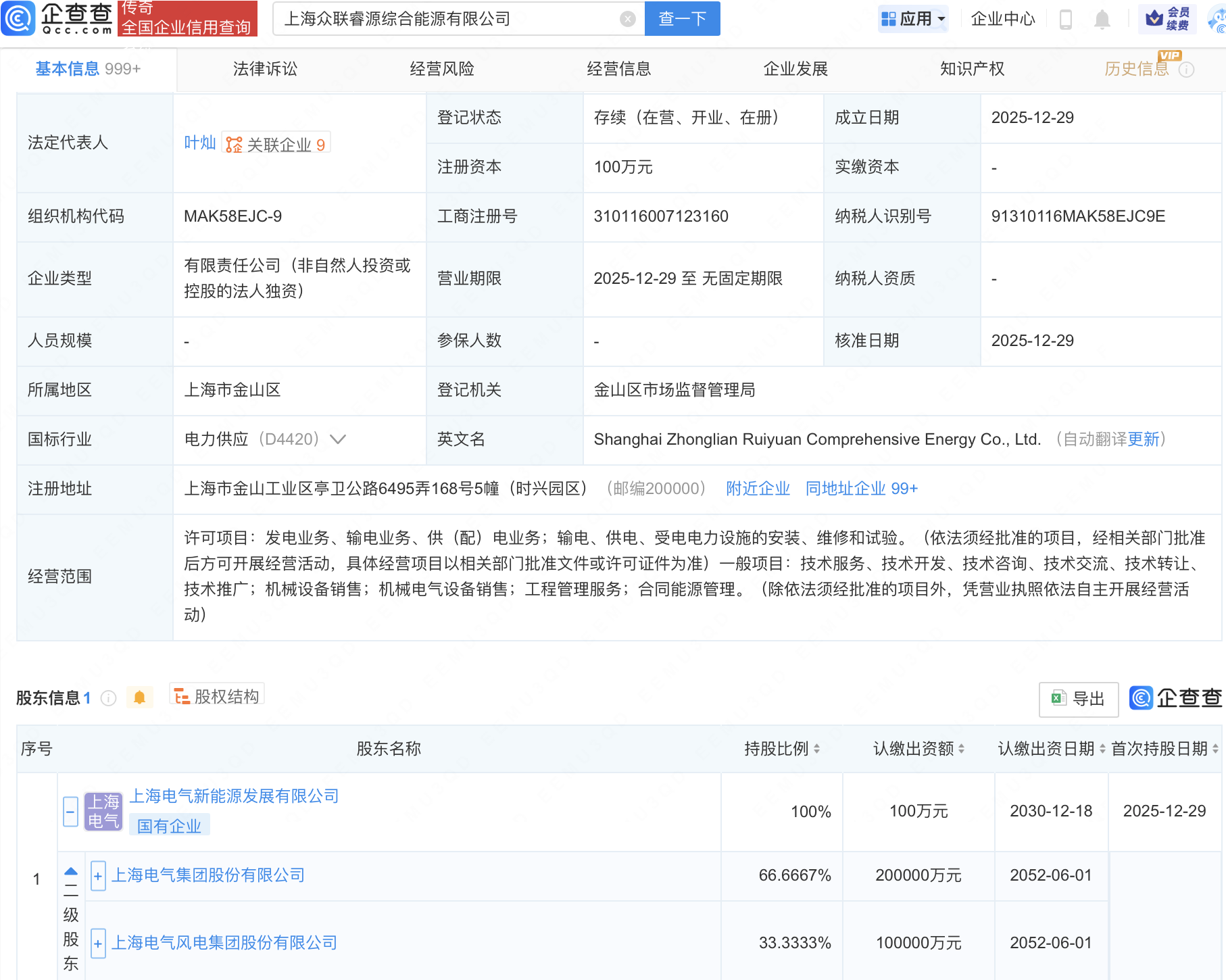 企查查APP显示,近日,上海众联睿源综合能源有限公司成立,经营范围包含:发电业务、输电业务、供(配)电业务;输电、供电、受电电力设施的安装、维修和试验等。企查查股权穿透显示,该公司由上海电气(601727)旗下上海电气新能源发展有限公司全资持股。