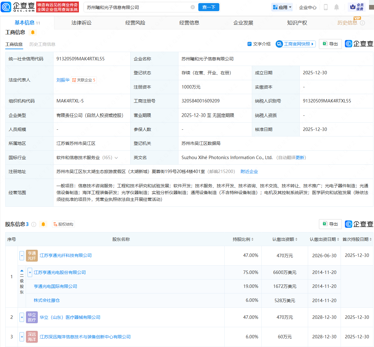 企查查APP显示,近日,苏州曦和光子信息有限公司成立,法定代表人为刘振华,注册资本为1000万元,经营范围包含:光电子器件制造;光通信设备制造;海洋工程装备研发;光学仪器制造等。企查查股权穿透显示,该公司由亨通光电(600487)旗下江苏亨通光纤科技有限公司、华立(山东)医疗器械有限公司等共同持股。