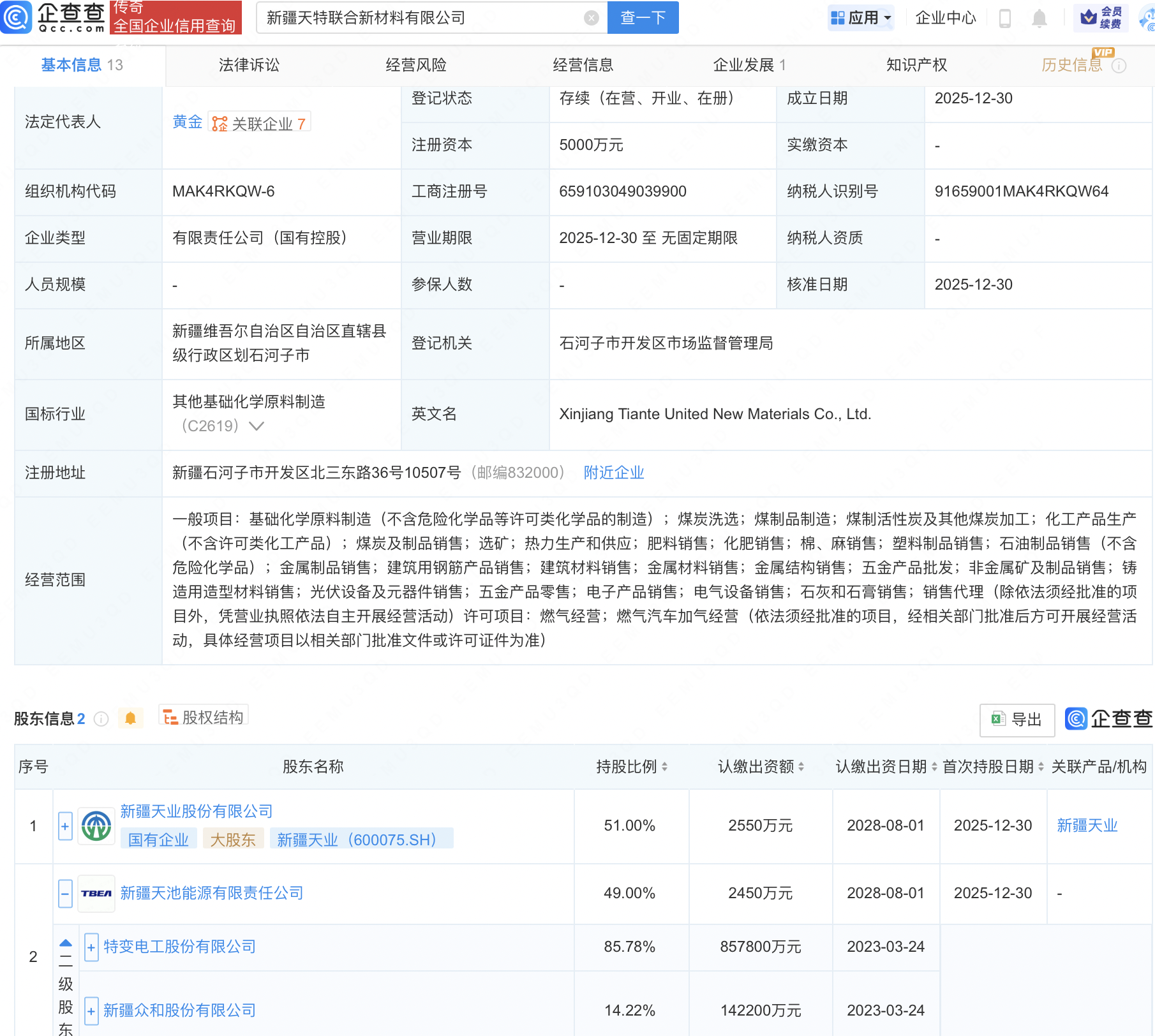 企查查APP显示,近日,新疆天特联合新材料有限公司成立,注册资本5000万元,经营范围包含:非金属矿及制品销售;铸造用造型材料销售;光伏设备及元器件销售等。企查查股权穿透显示,该公司由新疆天业(600075)、特变电工(600089)旗下新疆天池能源有限责任公司共同持股。