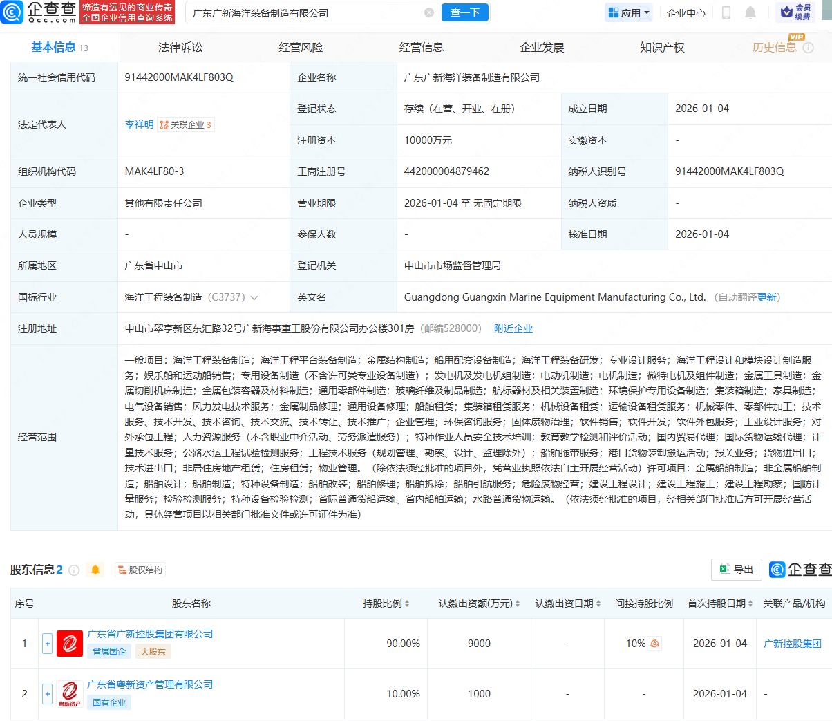 企查查APP显示,近日,广东广新海洋装备制造有限公司成立,法定代表人为李祥明,注册资本为1亿元,经营范围包含:海洋工程装备制造;海洋工程平台装备制造;金属结构制造;船用配套设备制造;海洋工程装备研发等。企查查股权穿透显示,该公司由广东省广新控股集团有限公司、广东省粤新资产管理有限公司共同持股。