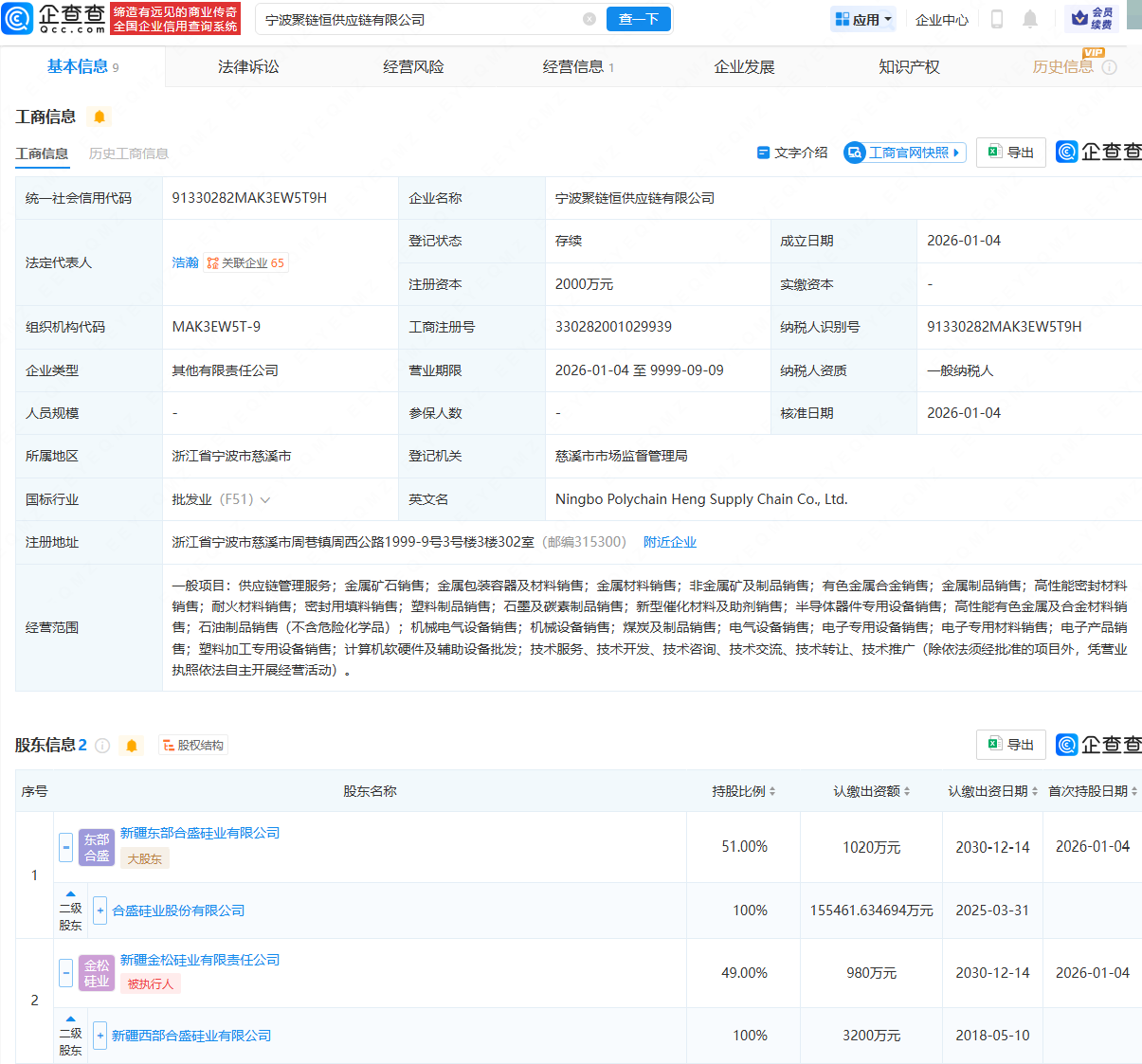 企查查APP显示,近日,宁波聚链恒供应链有限公司、宁波中寰供应链有限公司成立,法定代表人均为浩瀚,经营范围均包含:供应链管理服务;金属矿石销售;金属包装容器及材料销售;金属材料销售;有色金属合金销售等。企查查股权穿透显示,两家公司均由合盛硅业(603260)间接全资持股。