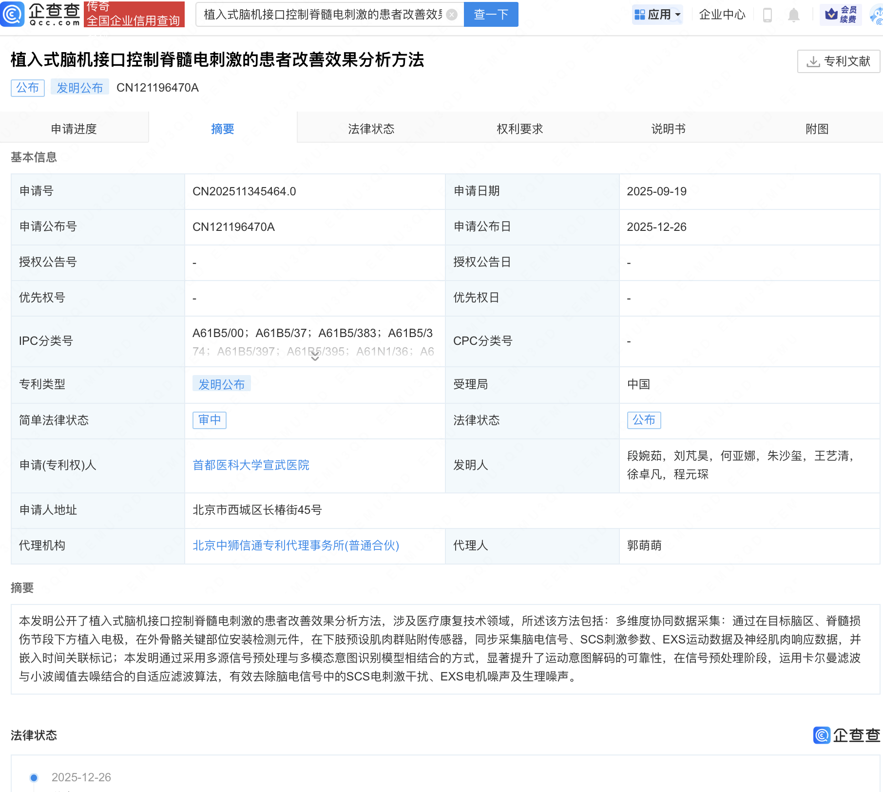 据悉,四川明确脑机接口医疗服务价格,置入费最高6583元/次。企查查APP显示,近期,成都、武汉、上海、北京等多地医院公开脑机接口专利。其中,四川省医学科学院·四川省人民医院“一种用于圆弧形脑机接口电池的固态电解质膜的制备方法”专利可满足不同脑机接口场景需求;华中科技大学同济医学院附属同济医院“一种颅骨下硬膜外微侵袭式柔性脑机接口电极”专利中脑机接口电极为柔性线型,可以植入至脑膜中动脉,无需开颅手术,不必担心长期植入后的炎症反应、免疫刺激、生物相容性、脑组织损伤等不利因素;复旦大学附属中山医院“一种基于脑机接口的硬膜外电刺激下肢康复系统与方法”专利可用于脊髓损伤患者术后康复;首都医科大学宣武医院“植入式脑机接口控制脊髓电刺激的患者改善效果分析方法”专利涉及医疗康复技术领域,可有效去除脑电信号中的SCS电刺激干扰、EXS电机噪声及生理噪声。