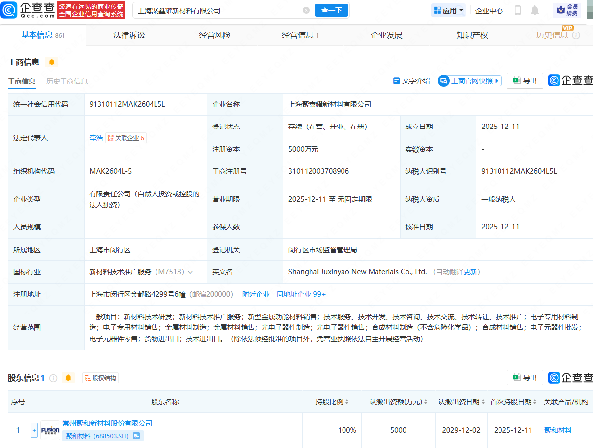 企查查APP显示,近日,上海聚鑫耀新材料有限公司成立,法定代表人为李浩,注册资本为5000万元,经营范围包含:新材料技术研发;新型金属功能材料销售;电子专用材料制造;金属材料制造;光电子器件制造等。企查查股权穿透显示,该公司由聚和材料(688503)全资持股。