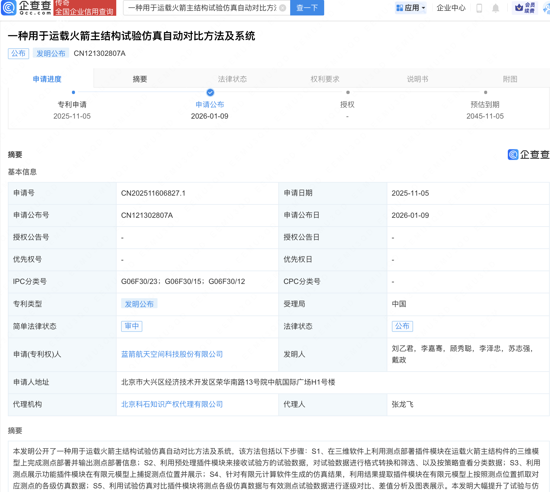 企查查APP显示,近日,蓝箭航天空间科技股份有限公司“一种用于运载火箭主结构试验仿真自动对比方法及系统”专利公布。企查查专利摘要显示,该方法包括以下步骤:S1、在三维软件上利用测点部署插件模块在运载火箭主结构件的三维模型上完成测点部署并输出测点部署信息;S2、利用预处理插件模块来接收试验方的试验数据,对试验数据进行格式转换和筛选、以及按策略查看分类数据;S3、利用测点展示功能插件模块在有限元模型上捕捉测点位置并展示;S4、针对有限元计算软件生成的仿真结果,利用结果提取插件模块在有限元模型上按照测点位置抓取对应测点的各级仿真数据;S5、利用试验仿真对比插件模块将测点各级仿真数据与有效测点试验数据进行逐级对比、差值分析及图表展示。本发明大幅提升了试验与仿真对比分析的工作效率。