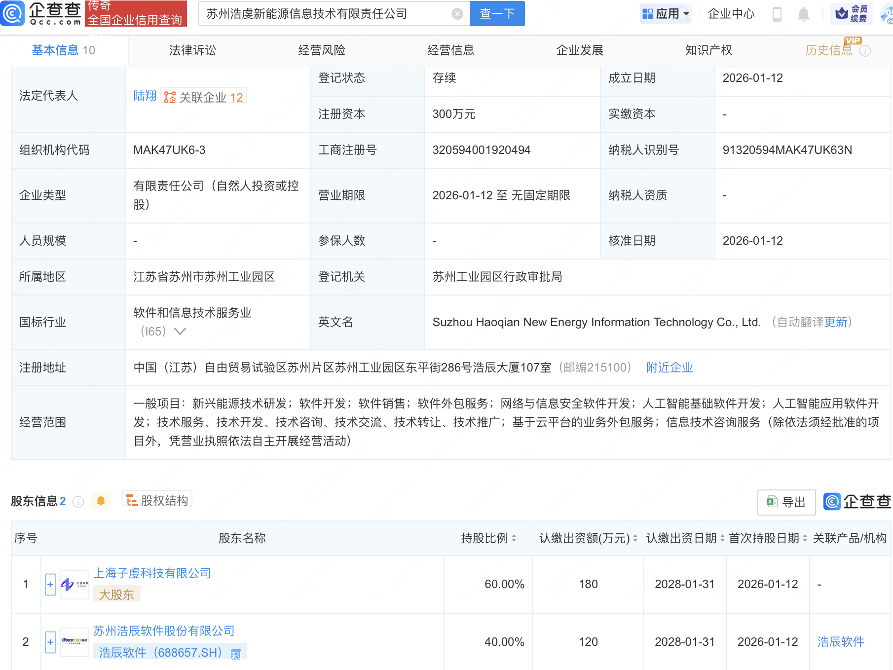 企查查APP显示,近日,苏州浩虔新能源信息技术有限责任公司成立,经营范围包含:新兴能源技术研发;网络与信息安全软件开发;人工智能基础软件开发;人工智能应用软件开发等。企查查股权穿透显示,该公司由浩辰软件(688657)等共同持股。