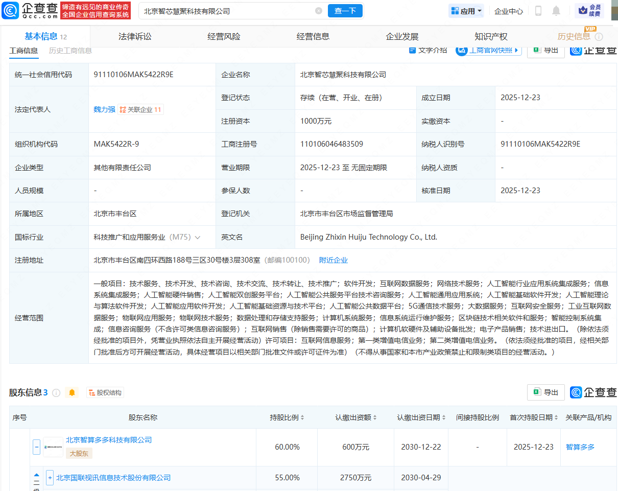 企查查APP显示,近日,北京智芯慧聚科技有限公司成立,法定代表人为魏力强,注册资本为1000万元,经营范围包含:人工智能硬件销售;人工智能双创服务平台;人工智能通用应用系统;5G通信技术服务等。企查查股权穿透显示,该公司由国联股份(603613)控股北京智算多多科技有限公司等共同持股。