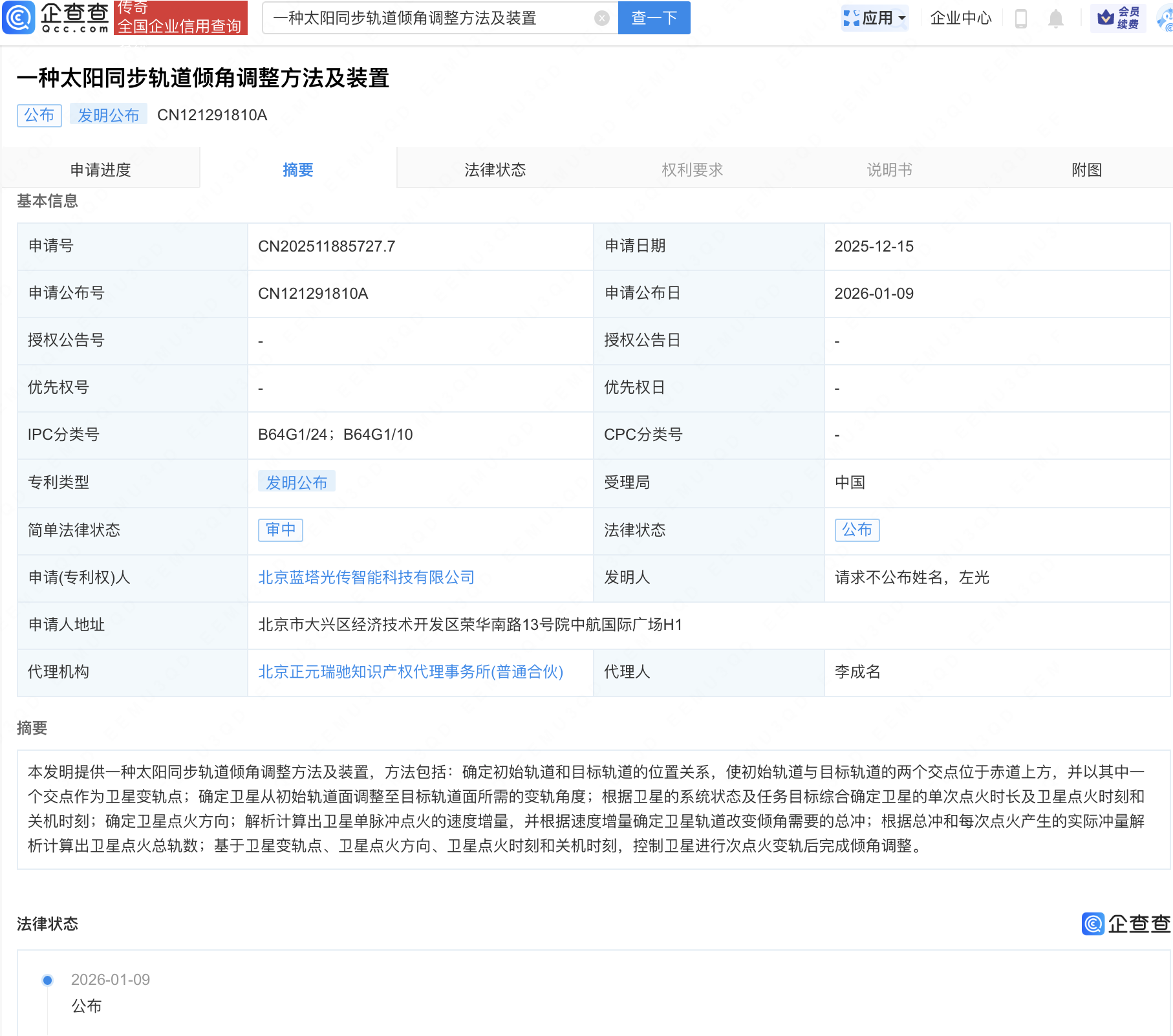 企查查APP显示,近日,北京蓝塔光传智能科技有限公司“星载基站的多波束波控信息转发方法和装置”、“一种太阳同步轨道倾角调整方法及装置”专利公布。专利摘要显示,前者专利过程可有效缩短从接收波控信息到完成波控信息转发所用的时间;后者专利可根据卫星的系统状态及任务目标综合确定卫星的单次点火时长及卫星点火时刻和关机时刻;确定卫星点火方向;解析计算出卫星单脉冲点火的速度增量,并根据速度增量确定卫星轨道改变倾角需要的总冲;根据总冲和每次点火产生的实际冲量解析计算出卫星点火总轨数;基于卫星变轨点、卫星点火方向、卫星点火时刻和关机时刻,控制卫星进行次点火变轨后完成倾角调整。
