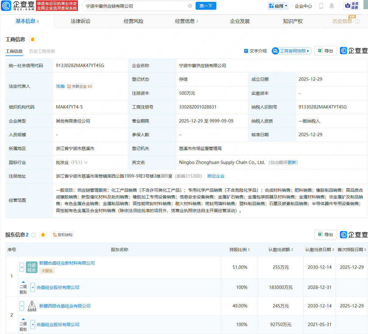 企查查APP显示,近日,宁波聚链恒供应链有限公司、宁波中寰供应链有限公司成立,法定代表人均为浩瀚,经营范围均包含:供应链管理服务;金属矿石销售;金属包装容器及材料销售;金属材料销售;有色金属合金销售等。企查查股权穿透显示,两家公司均由合盛硅业(603260)间接全资持股。