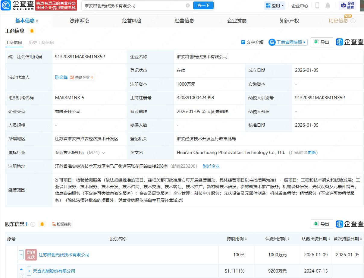 企查查APP显示,近日,淮安群创光伏技术有限公司成立,法定代表人为陈奕峰,注册资本为1000万元,经营范围包含:工业设计服务;新材料技术研发;新材料技术推广服务;机械设备研发;光伏设备及元器件销售等。企查查股权穿透显示,该公司由天合光能(688599)旗下江苏群创光伏技术有限公司全资持股。