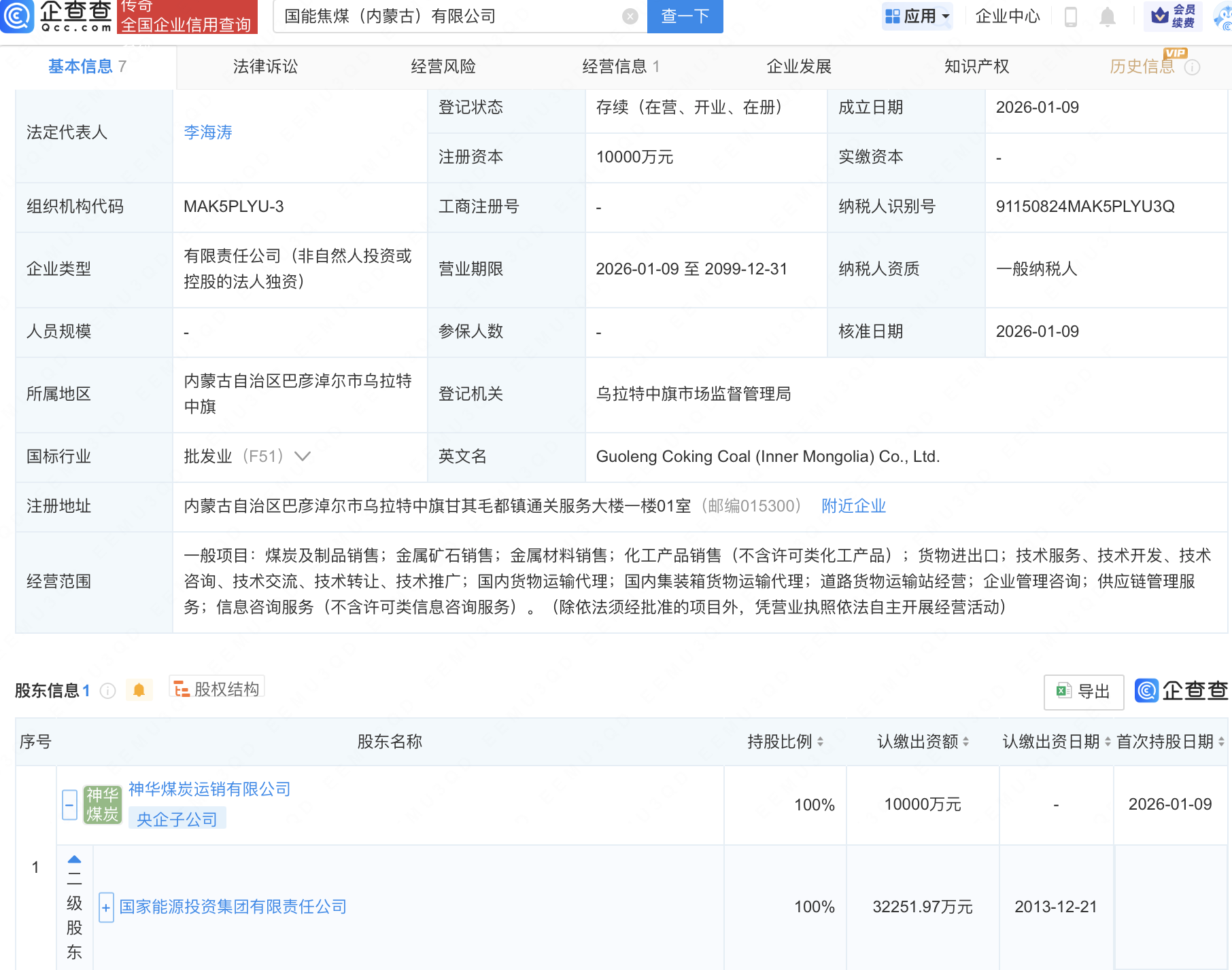 企查查APP显示,近日,国能焦煤(内蒙古)有限公司成立,注册资本1亿元,经营范围包含:煤炭及制品销售;金属矿石销售;金属材料销售;化工产品销售(不含许可类化工产品)等。企查查股权穿透显示,该公司由国家能源投资集团有限责任公司间接全资持股。