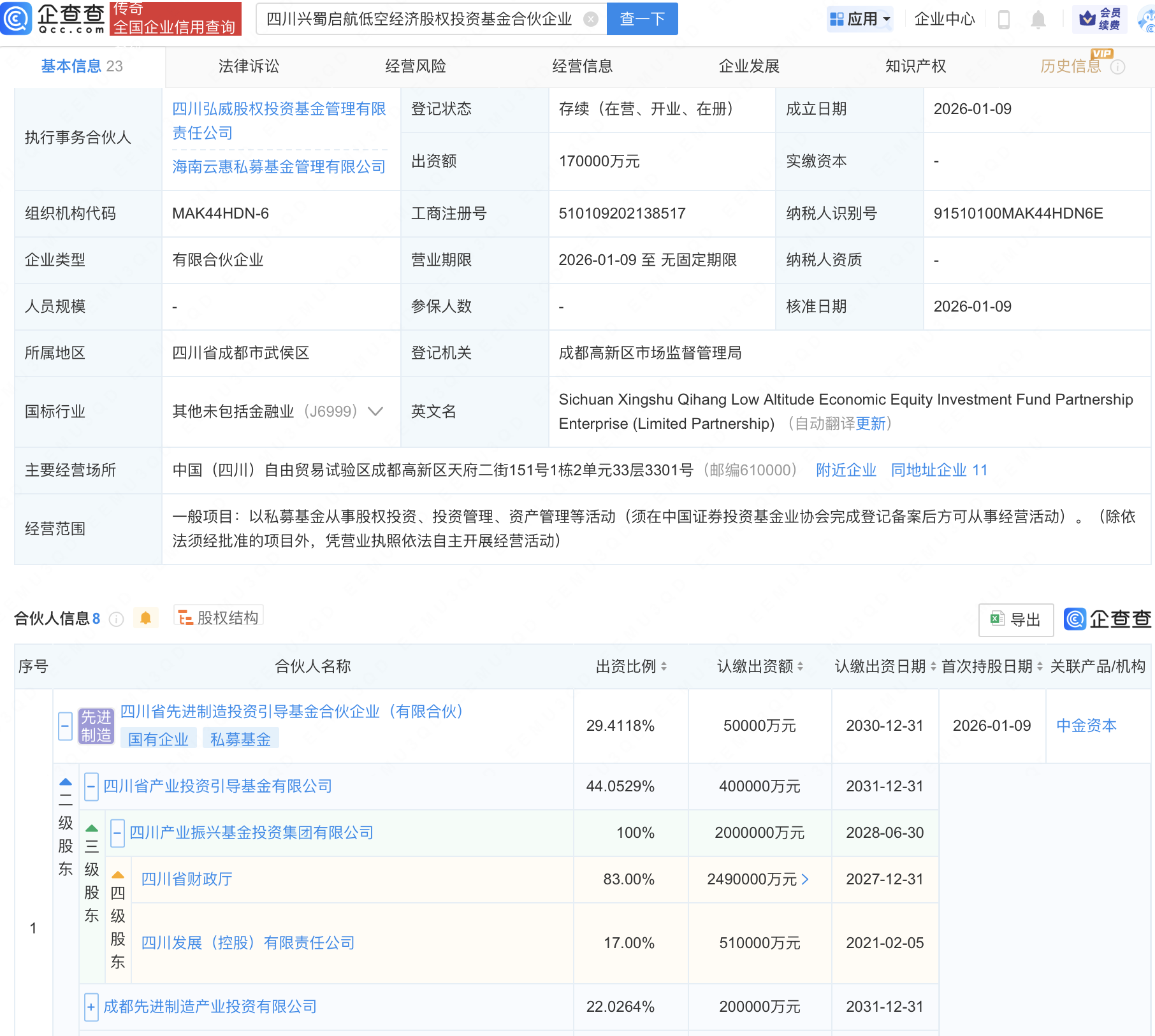 企查查APP显示,近日,四川兴蜀启航低空经济股权投资基金合伙企业(有限合伙)成立,出资额17亿元,经营范围包含:以私募基金从事股权投资、投资管理、资产管理等活动。企查查股权穿透显示,该企业由四川省先进制造投资引导基金合伙企业(有限合伙)等共同出资。