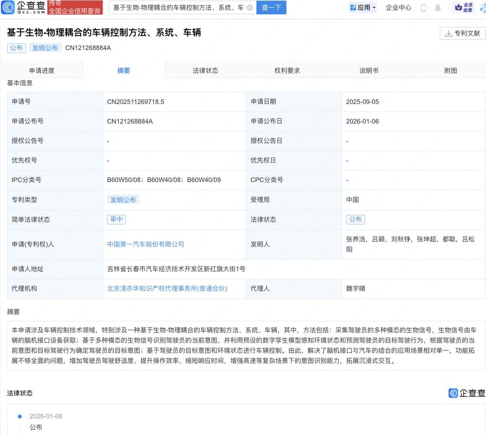 企查查APP显示,近日,中国第一汽车股份有限公司申请的“基于生物-物理耦合的车辆控制方法、系统、车辆”专利公布。企查查专利摘要显示,本申请涉及车辆控制技术领域,方法包括:采集驾驶员的多种模态的生物信号,生物信号由车辆的脑机接口设备获取;基于多种模态的生物信号识别驾驶员的当前意图,并利用预设的数字孪生模型感知环境状态和预测驾驶员的目标驾驶行为,根据驾驶员的当前意图和目标驾驶行为确定驾驶员的目标意图;基于驾驶员的目标意图和环境状态进行车辆控制。由此,解决了脑机接口与汽车的结合的应用场景相对单一,功能拓展不够全面的问题,增加驾驶员驾驶舒适度,提升操作效率,缩短响应时间,增强高速等复杂场景下的意图识别能力,拓展沉浸式交互。