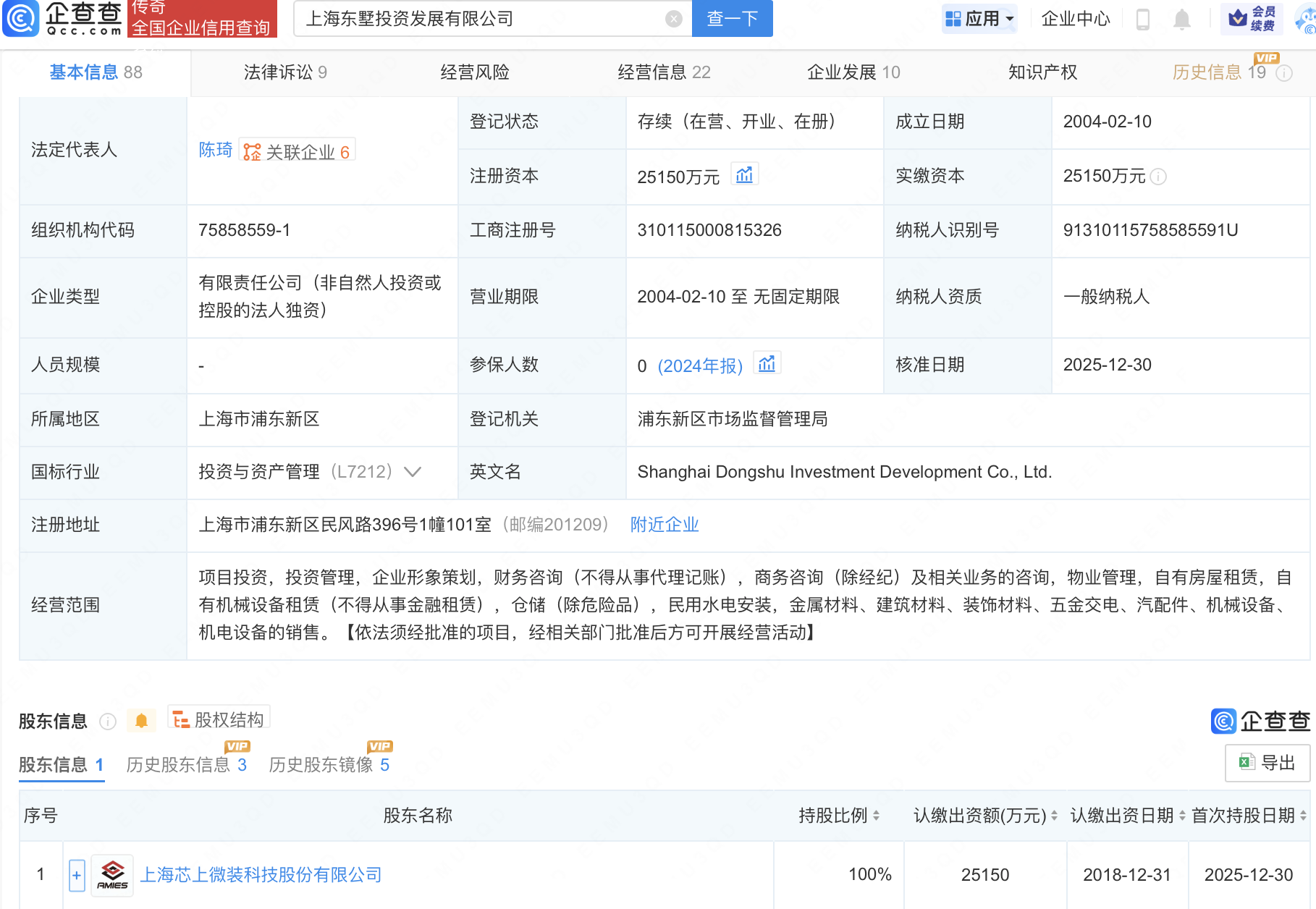企查查APP显示,近日,上海东墅投资发展有限公司发生工商变更,上海微电子装备(集团)股份有限公司退出股东,新增上海芯上微装科技股份有限公司为全资股东,认缴出资额2.52亿。企查查信息显示,该公司成立于2004年,经营范围包含:项目投资,投资管理,企业形象策划,财务咨询(不得从事代理记账)等。此前,芯上微装已接手上海微电子旗下上海威耀实业有限公司。