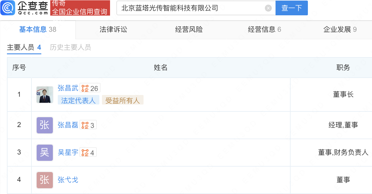 企查查显示,北京蓝塔光传智能科技有限公司成立于2025年4月,法定代表人及董事长为蓝箭航天创始人张昌武,由蓝箭航天空间科技股份有限公司等共同持股。