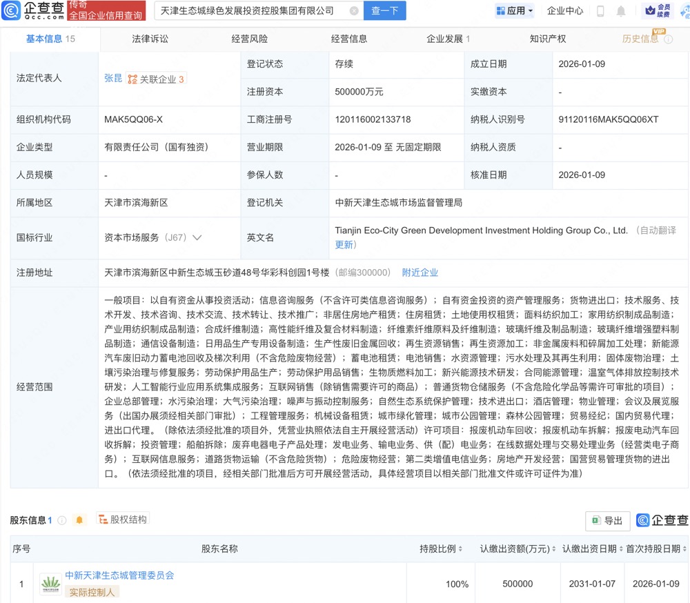 企查查APP显示,近日,天津生态城绿色发展投资控股集团有限公司成立,法定代表人为张昆,注册资本50亿元,经营范围含以自有资金从事投资活动、自有资金投资的资产管理服务、人工智能行业应用系统集成服务、互联网销售等。企查查股权穿透显示,该公司由中新天津生态城管理委员会全资持股。