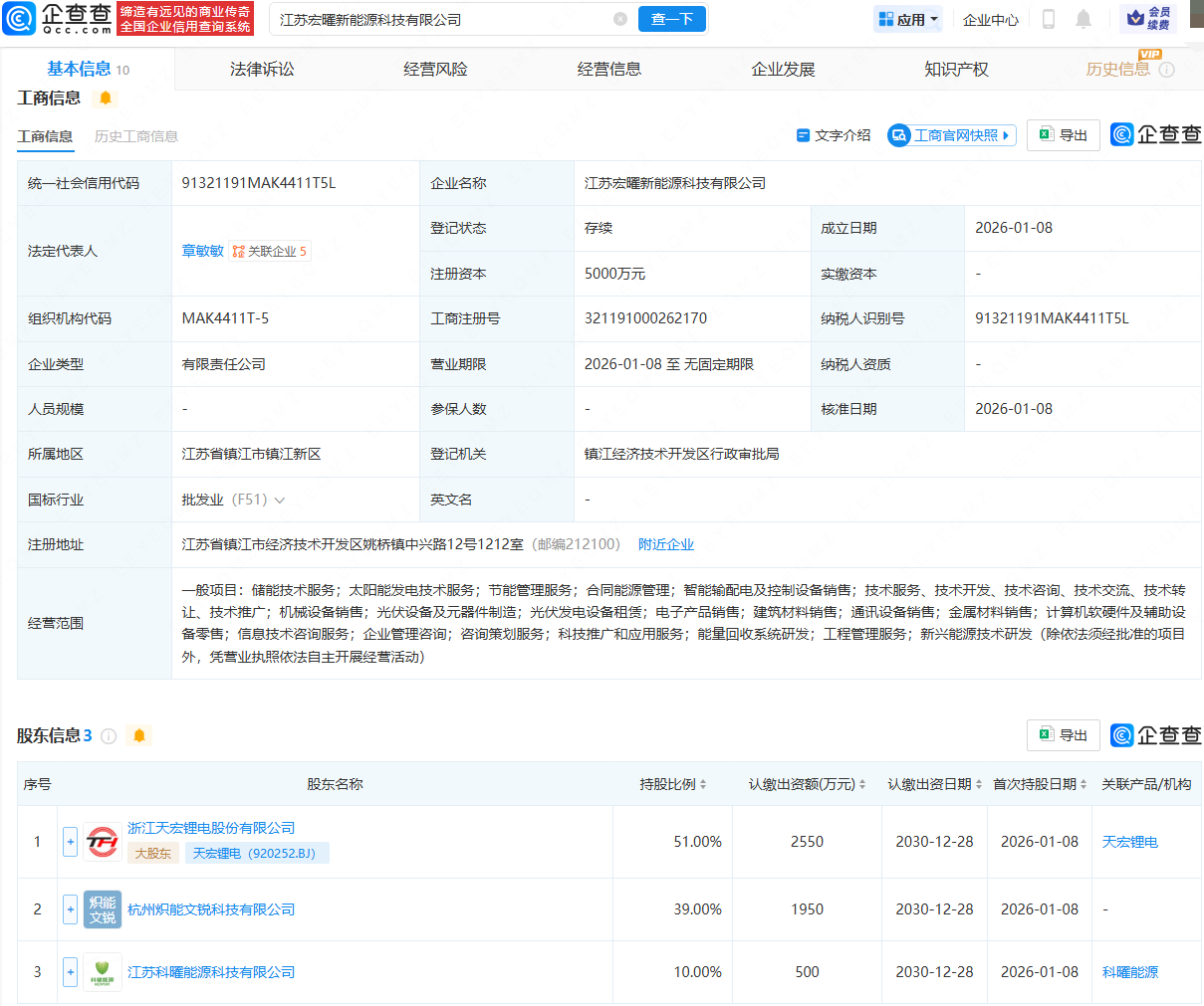 企查查APP显示,近日,江苏宏曜新能源科技有限公司成立,法定代表人为章敏敏,注册资本为5000万元,经营范围包含:储能技术服务;太阳能发电技术服务;节能管理服务;合同能源管理;金属材料销售等。企查查股权穿透显示,该公司由天宏锂电(920252)、杭州炽能文锐科技有限公司等共同持股。