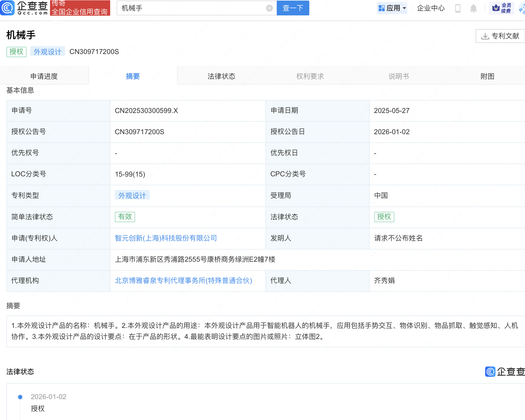企查查APP显示,近日,智元机器人关联公司智元创新(上海)科技股份有限公司“机械手”专利获授权。企查查专利摘要显示,本外观设计产品用于智能机器人的机械手,应用包括手势交互、物体识别、物品抓取、触觉感知、人机协作,其设计要点在于产品的形状。
