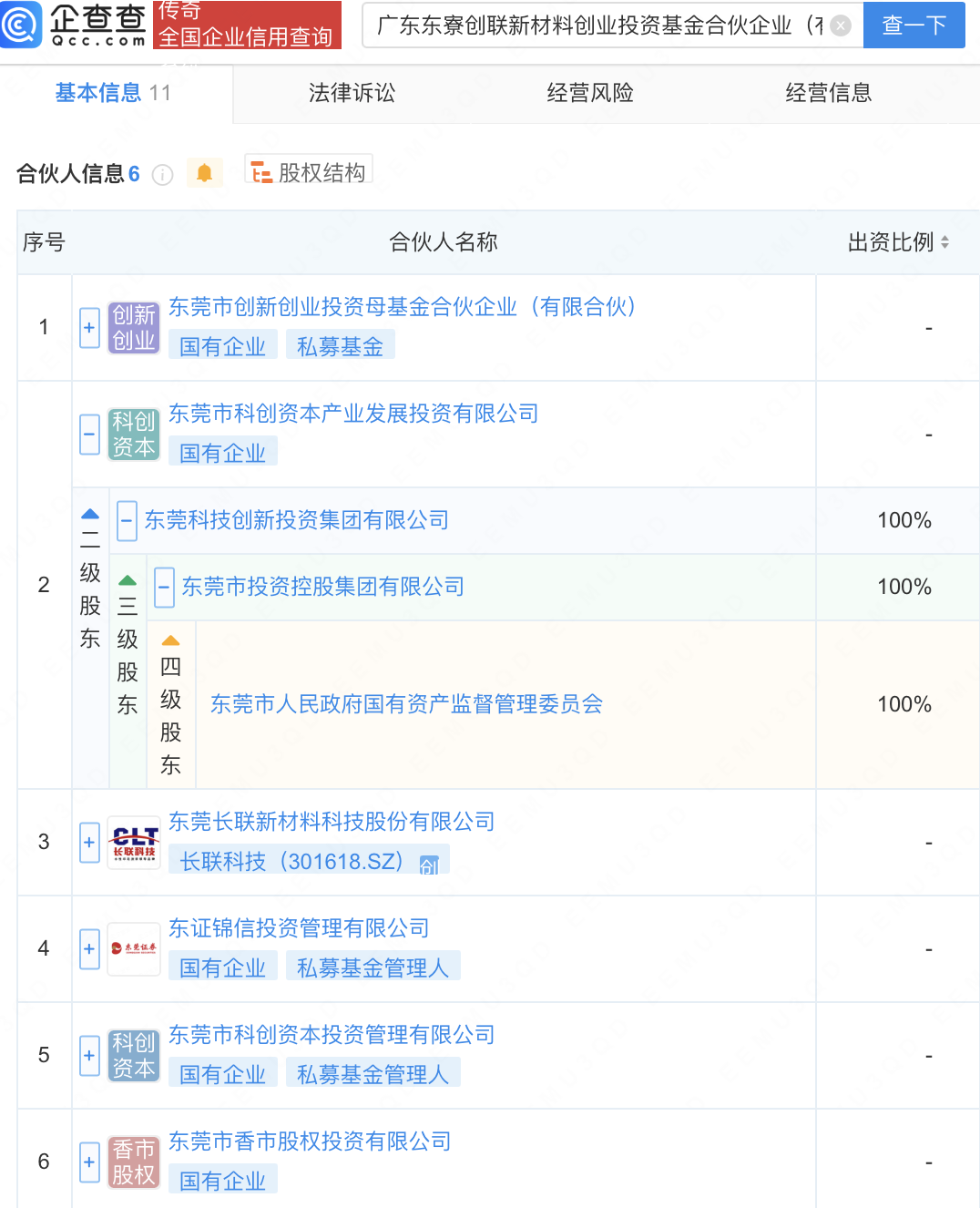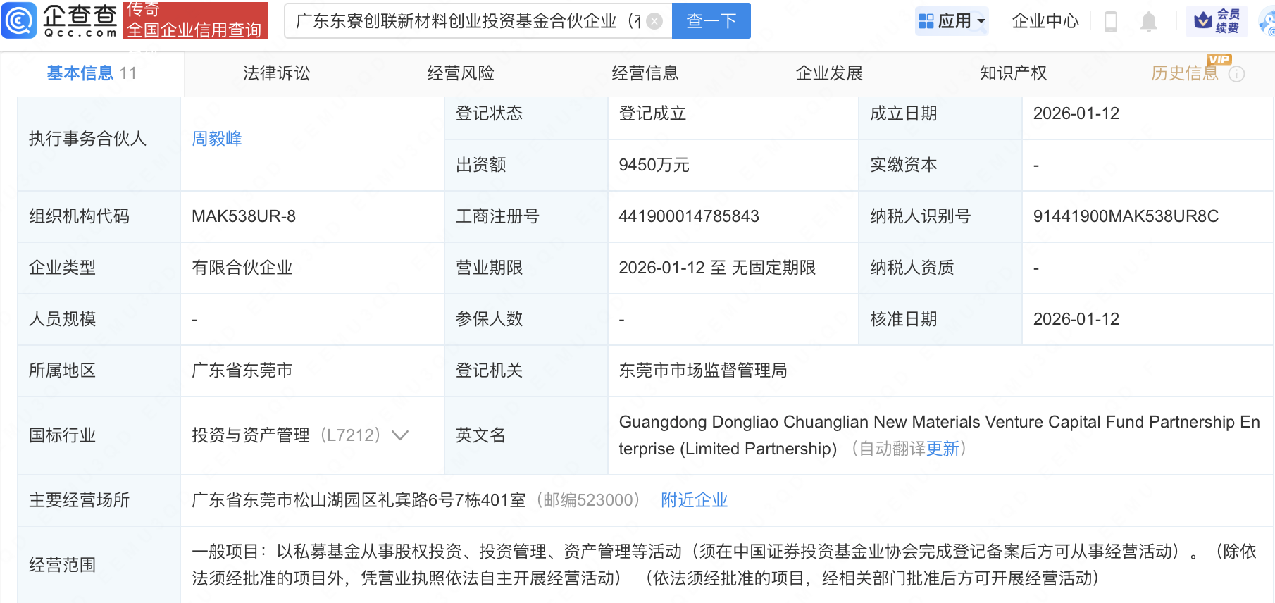 企查查APP显示,近日,广东东寮创联新材料创业投资基金合伙企业(有限合伙)成立,经营范围包含:以私募基金从事股权投资、投资管理、资产管理等活动。企查查股权穿透显示,该企业由东莞市科创资本产业发展投资有限公司、长联科技(301618)等共同出资。